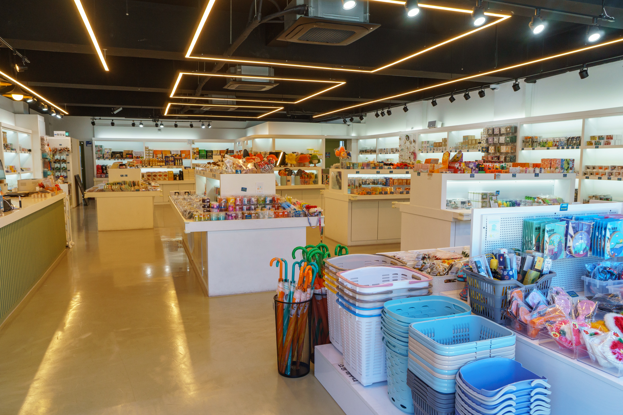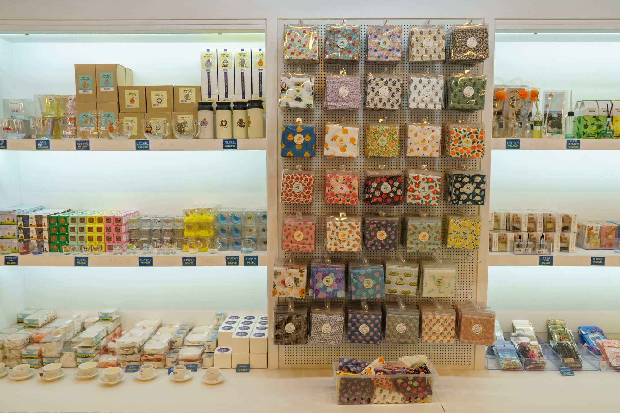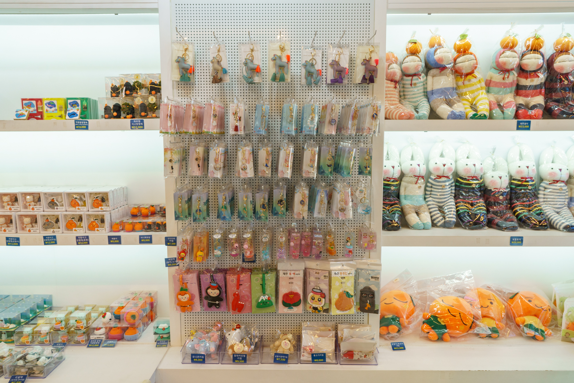 제주도 기념품샵을 따라 들어가면 보이는 카운터 옆으로는 여름철 갑작스럽게 소나기가 내릴 때 사용하기 좋은 한라봉 우비와 우산이 있으며 여러 디자인으로 제작된 마그넷부터 핸드백, 에코백 등이 색상별, 크기별로 진열되어 있다.