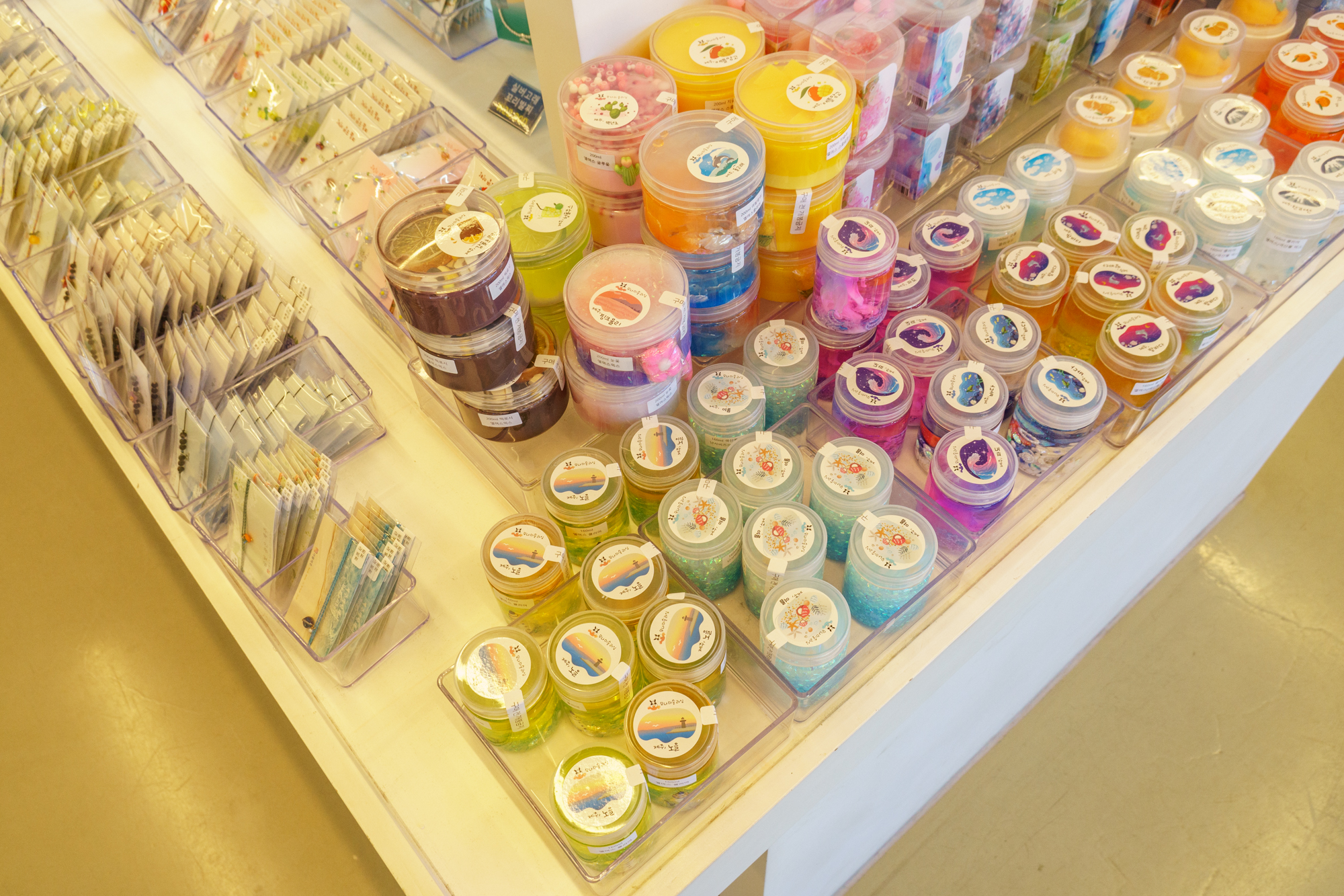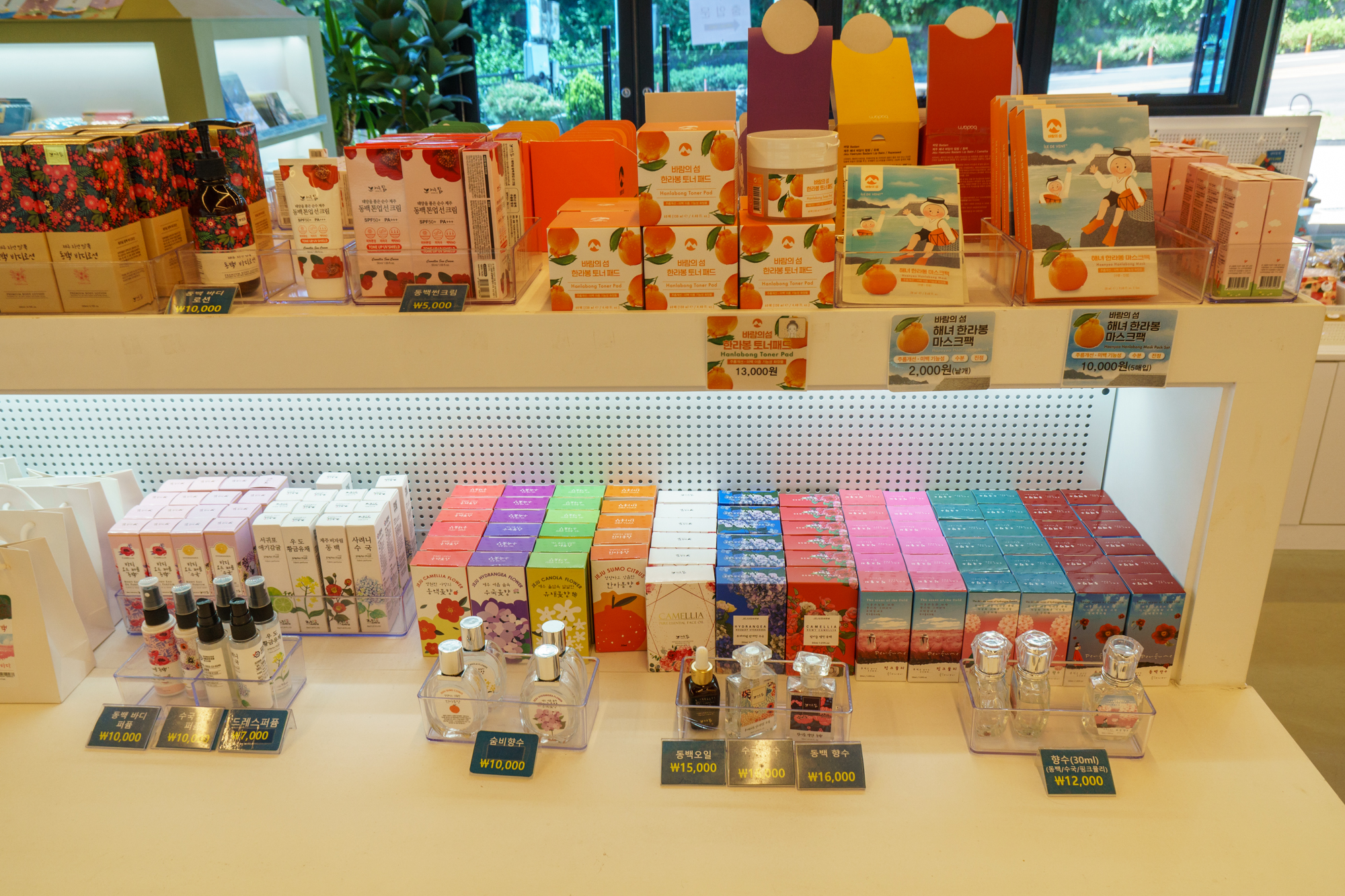 제주도 기념품샵 만달에 가서 봤던 제품 중 가장 먼저 보였던 진열장에는 여행을 하면서 숙소에 머무는 동안 사용하기 좋은 수제비누, 샴푸, 바디워시가 있으며 뒤쪽으로는 감귤 핸드크림, 치약, 동백향수, 오일도 보였다.