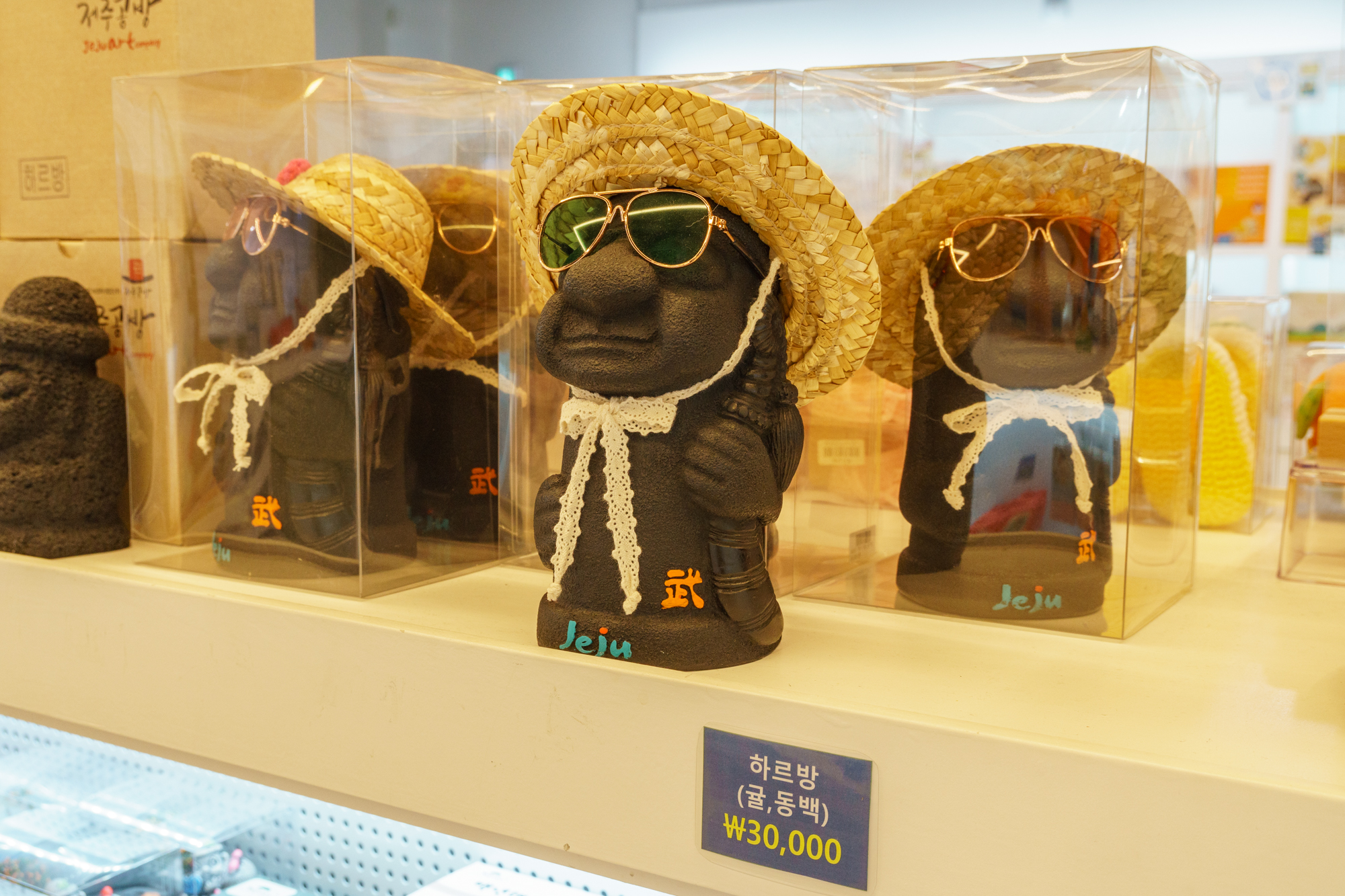 제주도 기념품샵에 가서 만났던 선물 상품 중에서 소개하고 싶은 것으로는 여름철 수국과 해바라기 명소에 가서 사진을 찍을 때 소품으로 활용하기 좋은 감귤모자와 감귤선글라스가 있으며 여러 패턴을 담은 배지와 함께 부모님 선물로 추천하고 싶은 돌하르방 조형물도 있었다.