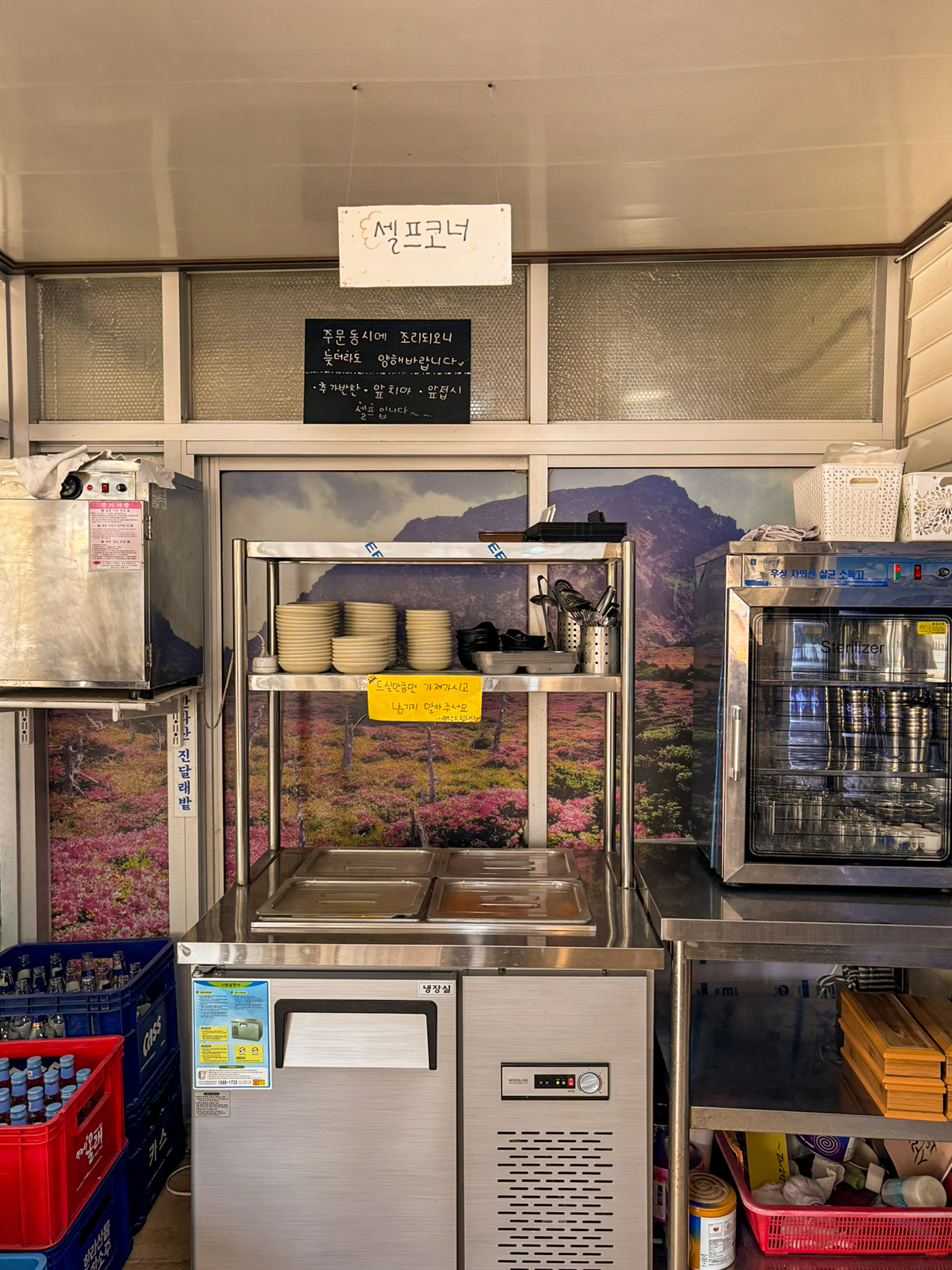 카운터 옆에는 셀프코너가 있어 단무지, 깍두기, 양파 등 반찬이 모자라면 직접 가져다가 먹을 수 있다. 앞치마, 앞접시, 식기 또한 셀프로 인원 수만큼 이곳에서 챙기면 된다.