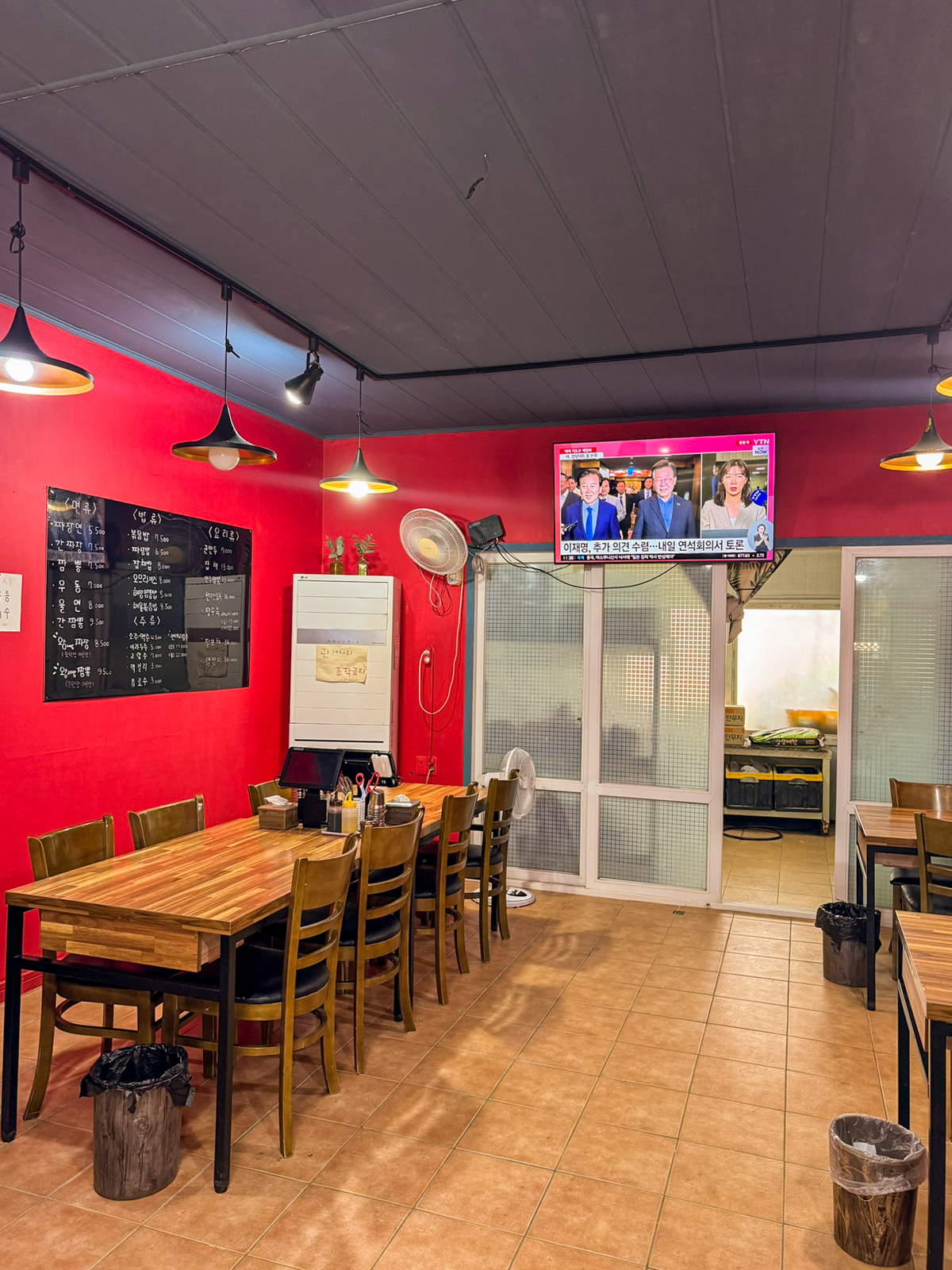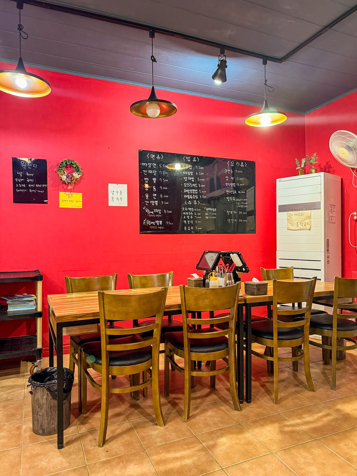 제주 현지인 추천 맛집 애월 왕서방 내부 또한 여러 명이 앉을 수 있는 홀 테이블이 있으며 오랜 시간 운영했음에도 전체적으로 깨끗한 느낌으로 청결했고 테이블 아래에는 휴지통도 하나씩 있었다.
