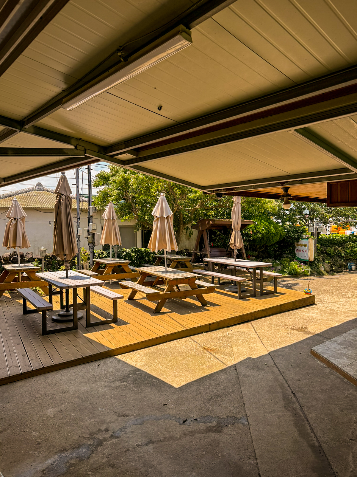 야외 테이블에는 햇빛을 가려주는 가리개가 설치되어 있으며 그네의자도 설치되어 있기에 날씨가 좋은 날 아이들과 함께 갈만한 제주 중식당을 찾는 분들에게 알려주고 싶었다.