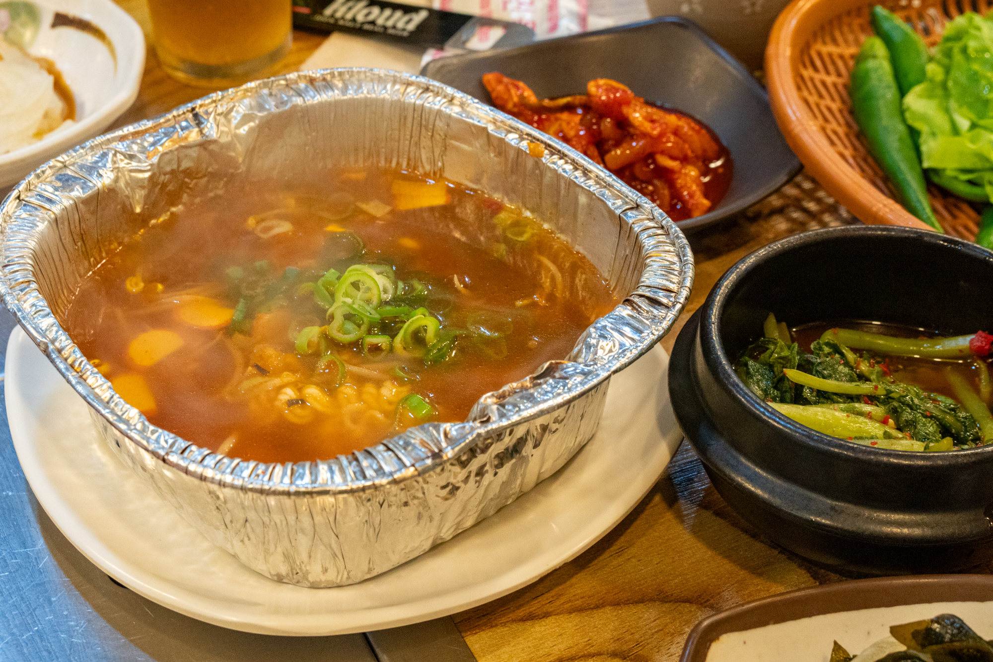 또한 다른 고기집과 다르게 제주 황금돈가에서는 고기를 주문하면 콩나물과 계란이 들어간 라면이 서비스로 나온다. 국물 자체가 맵지 않아 아이들도 충분히 먹을 수 있고 술안주로도 좋아서 제주 연동 맛집으로 가기 좋았다.