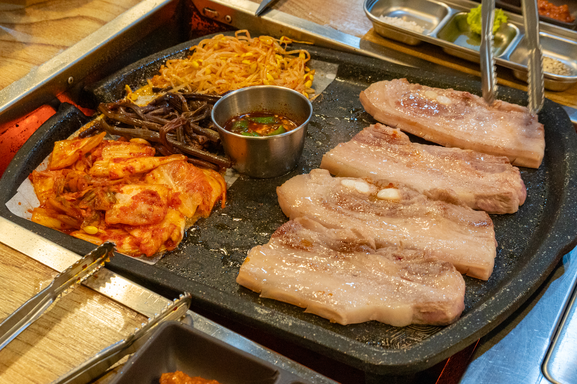 제주도 흑돼지를 주문하면 콩나물, 고사리, 김치와 함께 두툼한 크기의 오겹살을 직원이 직접 구워주고 잘라줘서 편하게 저녁식사를 할 수 있었다.