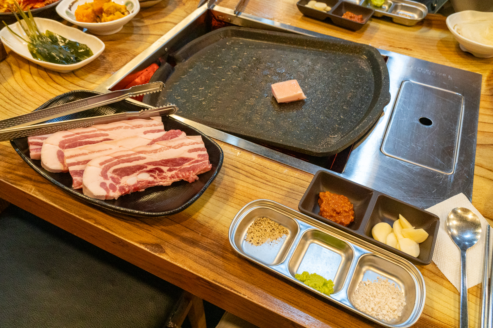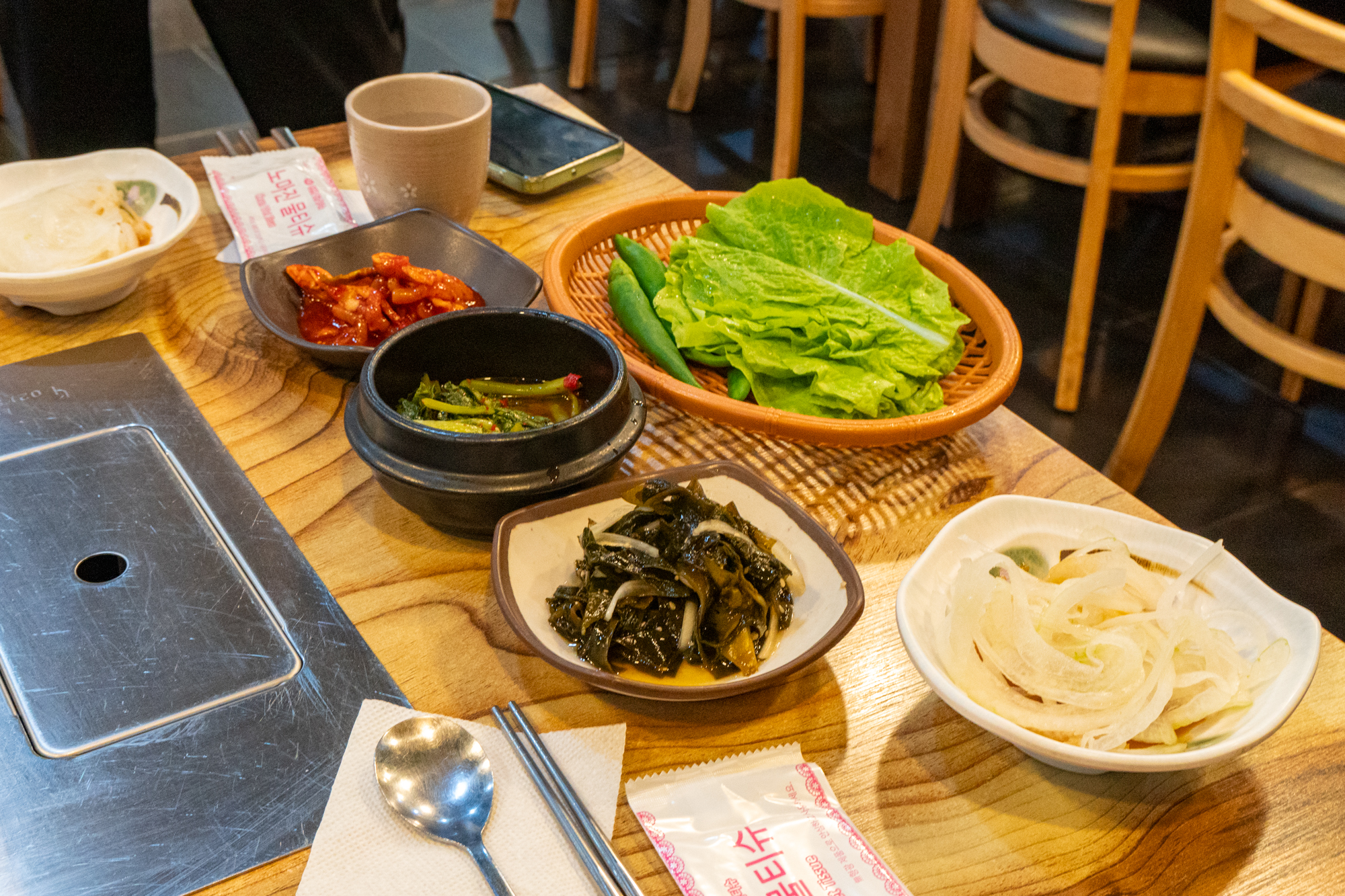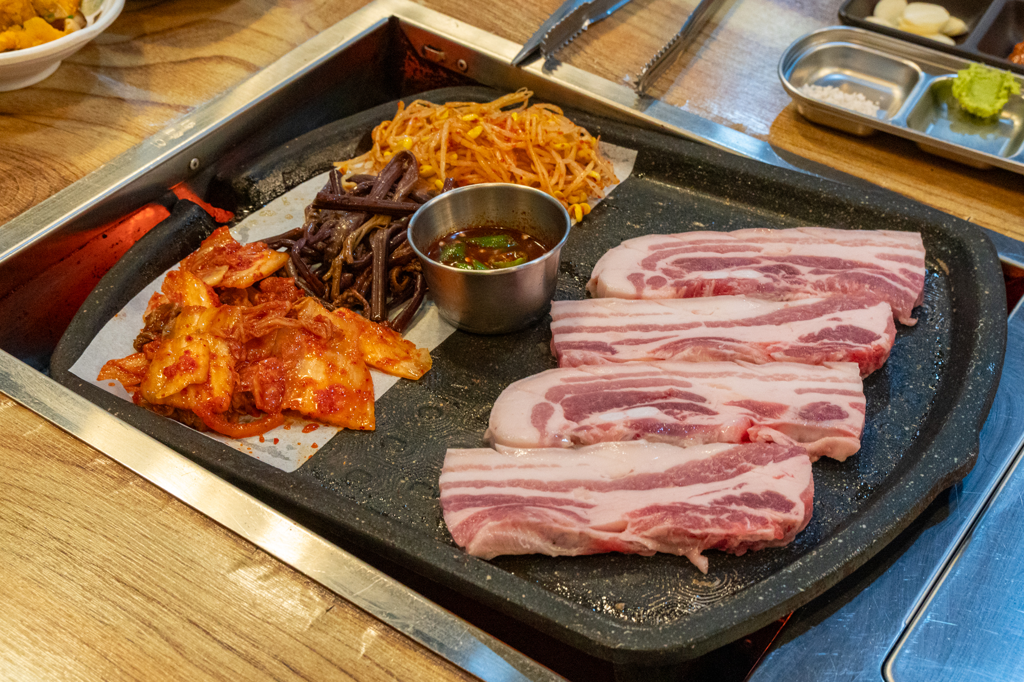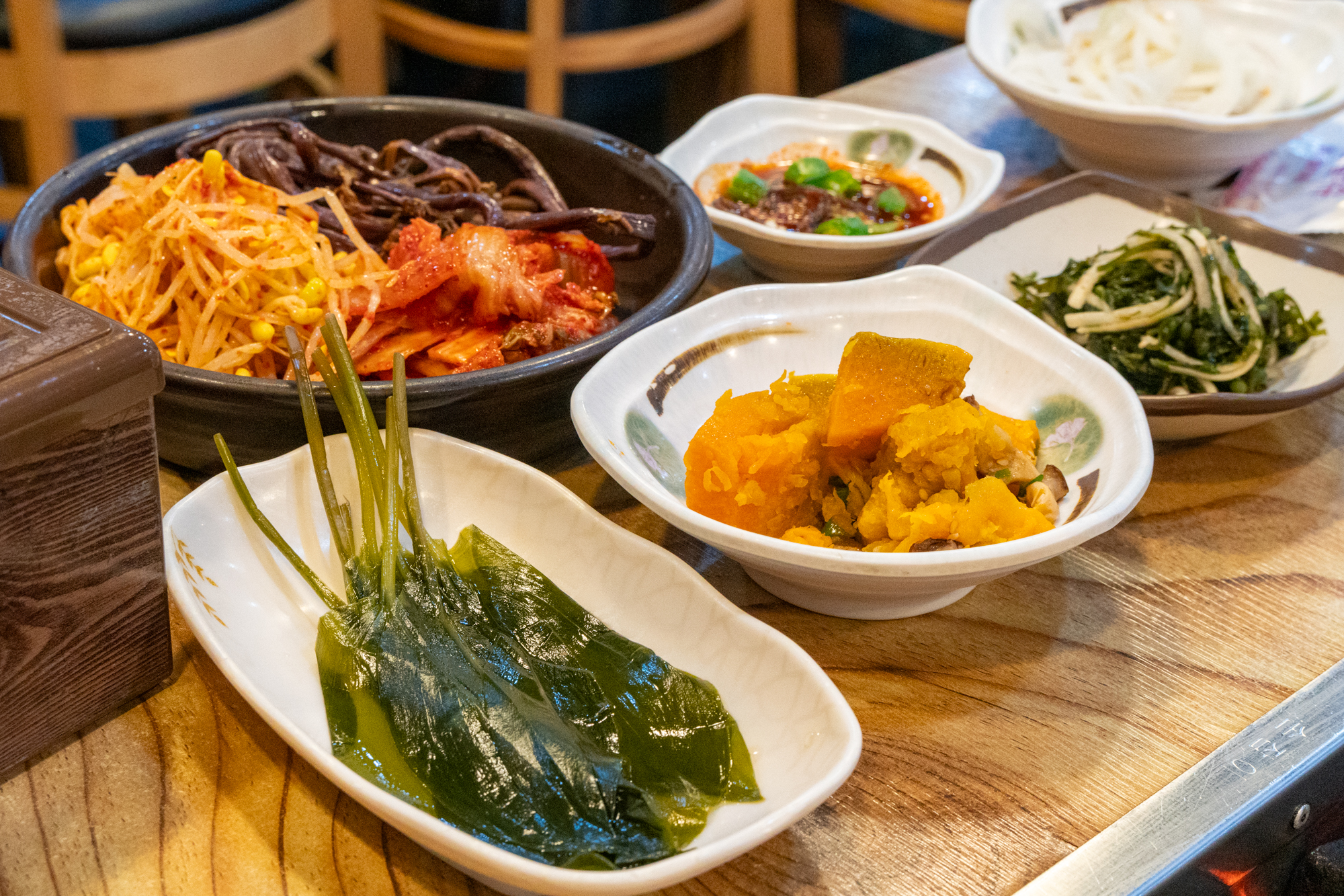 고기와 함께 불판에 구워먹을 수 있는 콩나물, 고사리, 김치가 나오며 명이나물, 호박무침, 미역, 파무침 등 고기와 함께 곁들이기 좋은 반찬이 나오는데 하나같이 짜지 않고 깔끔한 맛을 자랑했다.