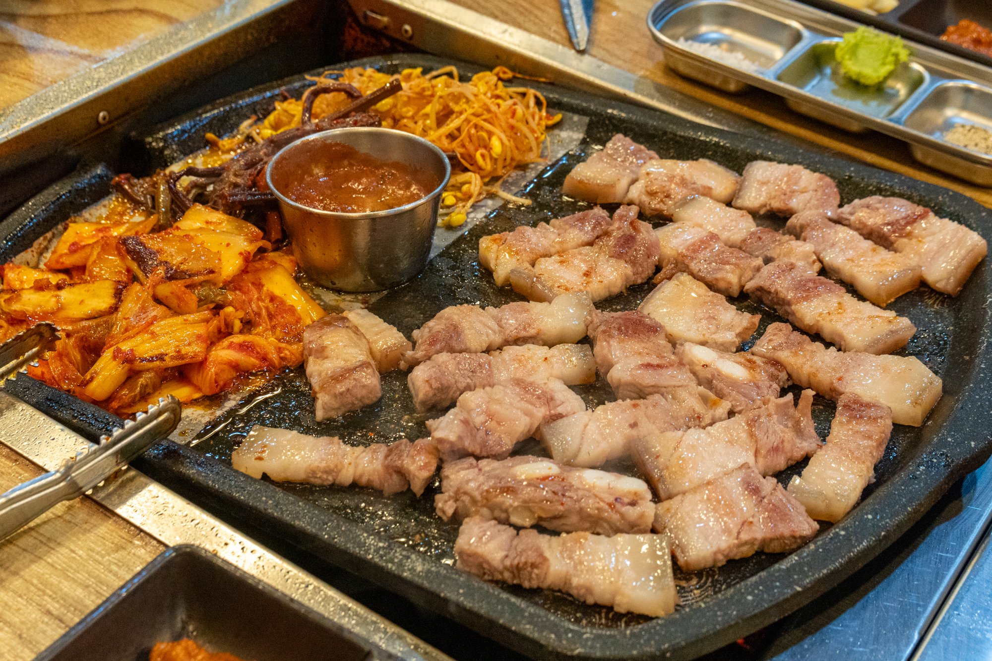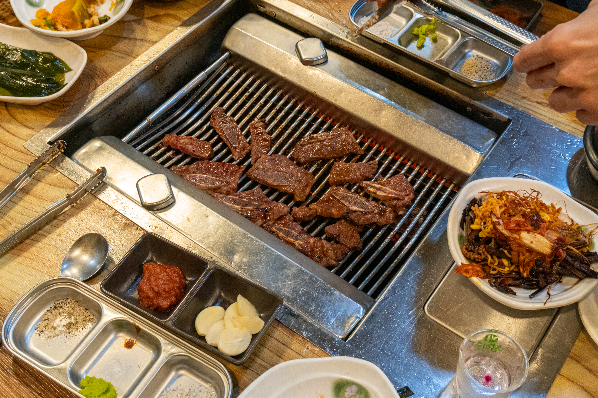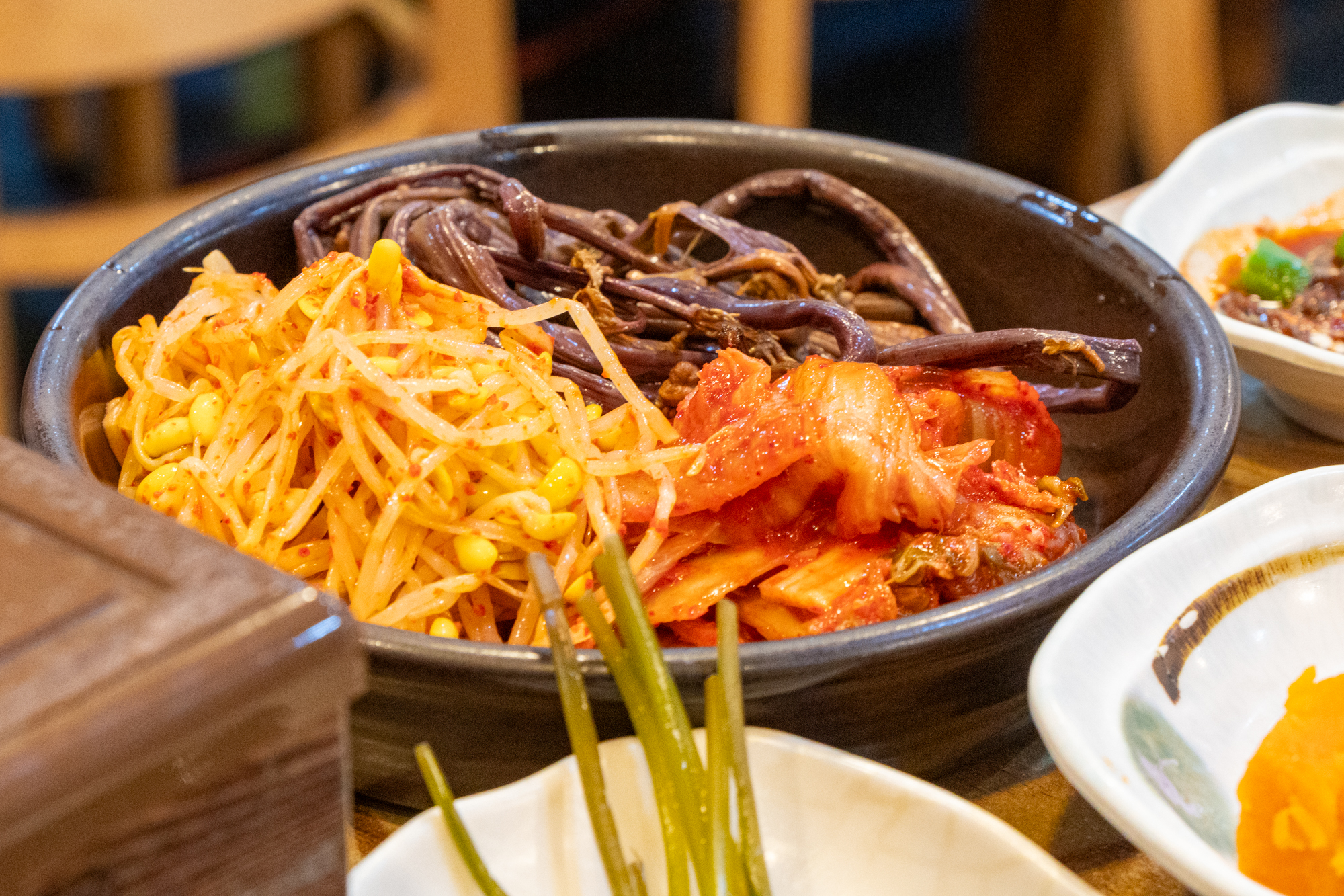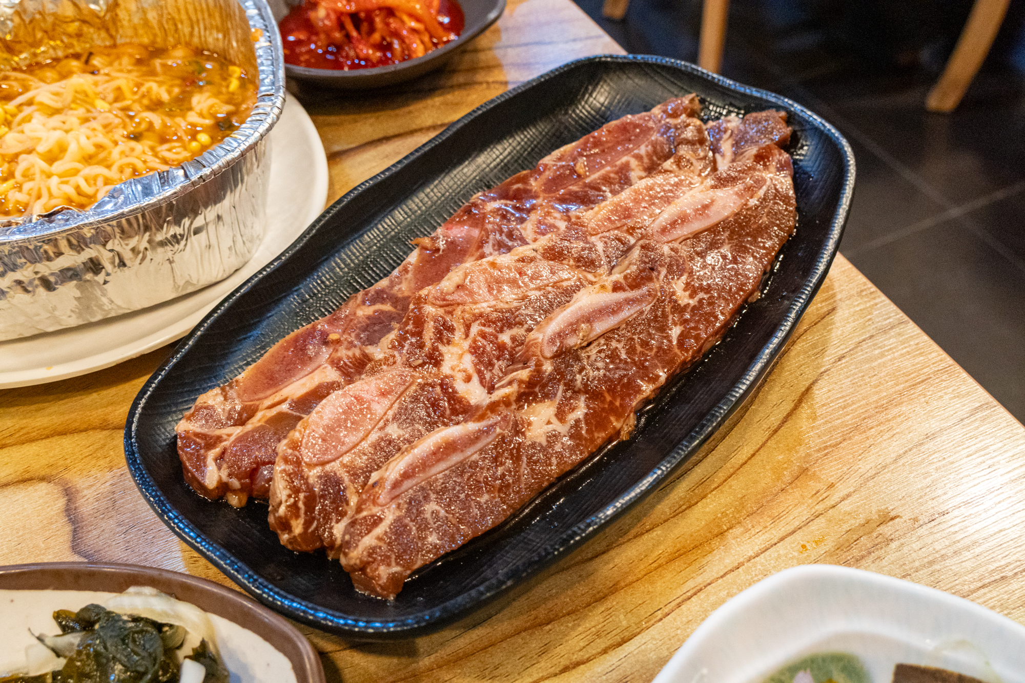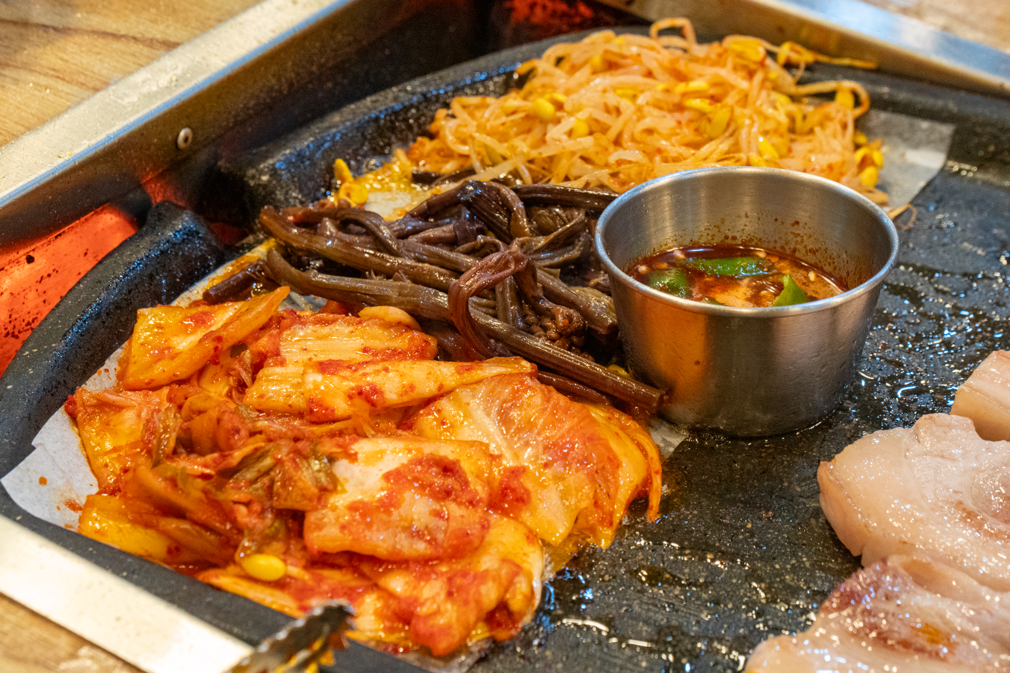 고기와 함께 불판에 구워먹을 수 있는 콩나물, 고사리, 김치가 나오며 명이나물, 호박무침, 미역, 파무침 등 고기와 함께 곁들이기 좋은 반찬이 나오는데 하나같이 짜지 않고 깔끔한 맛을 자랑했다.