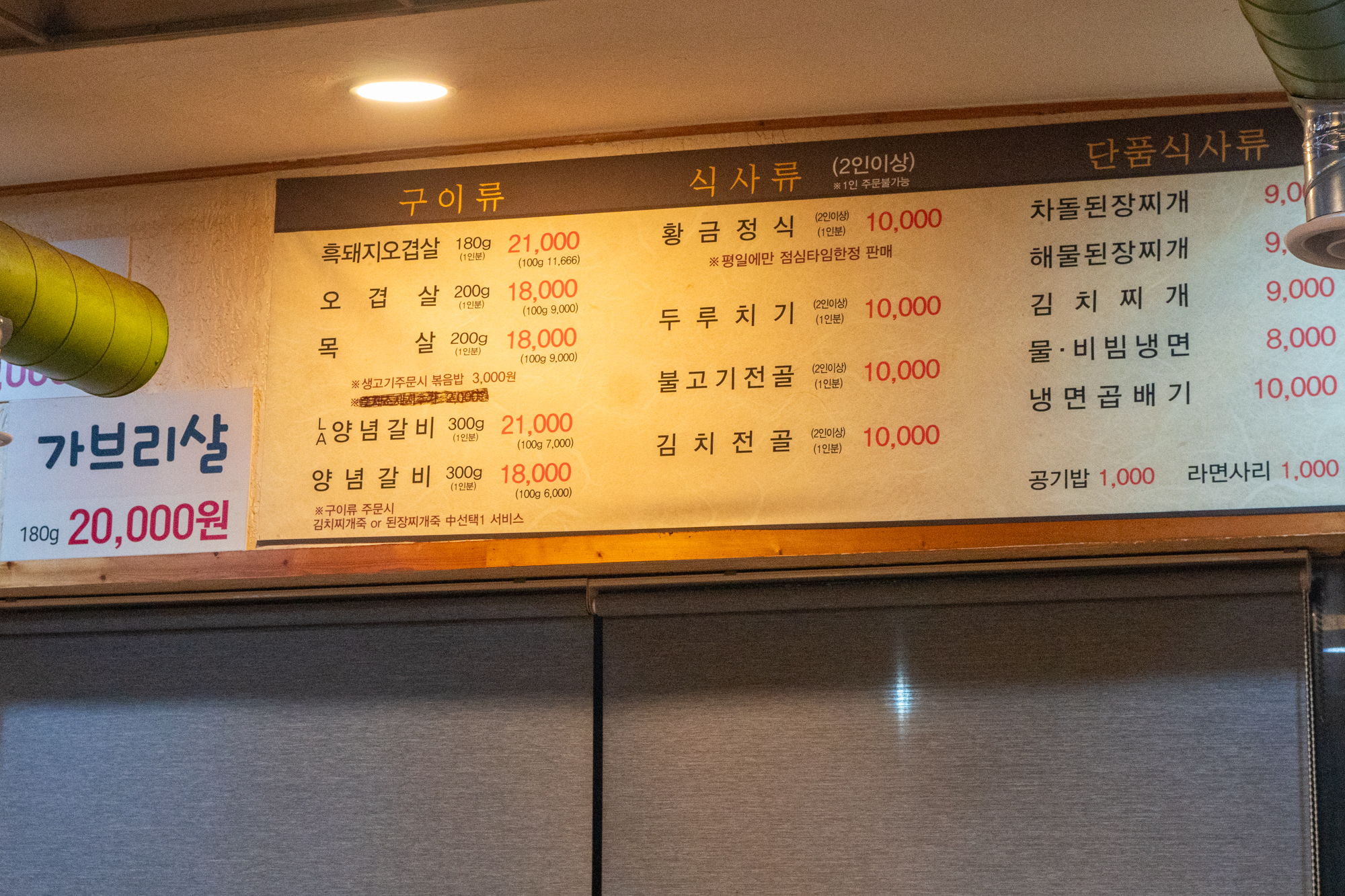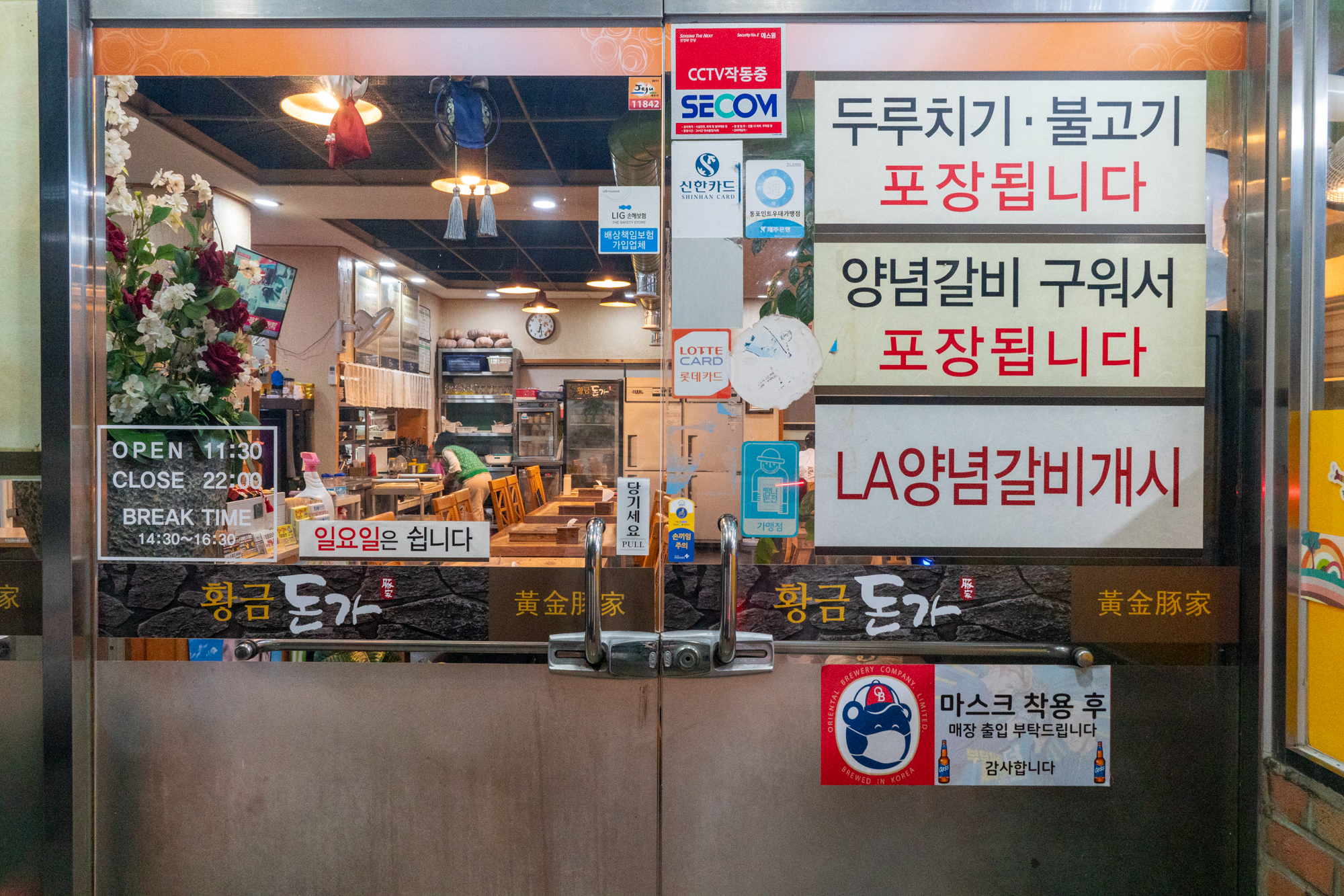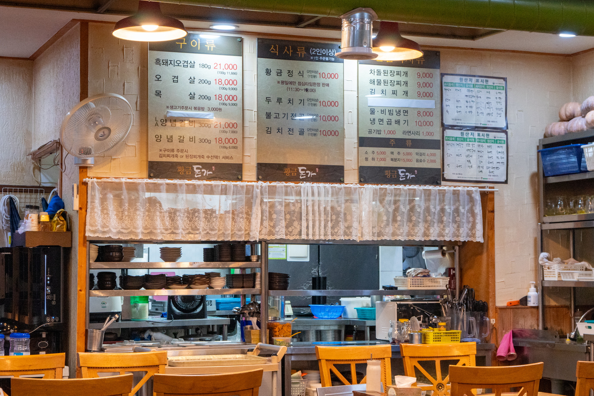 운영시간은 매주 일요일을 제외한 오전 11시 30분부터 오후 10시까지이지만 오전 11시 30분~오후 2시 30분에는 고기류가 아닌 황금정식과 같은 식사메뉴만 주문이 가능하다.