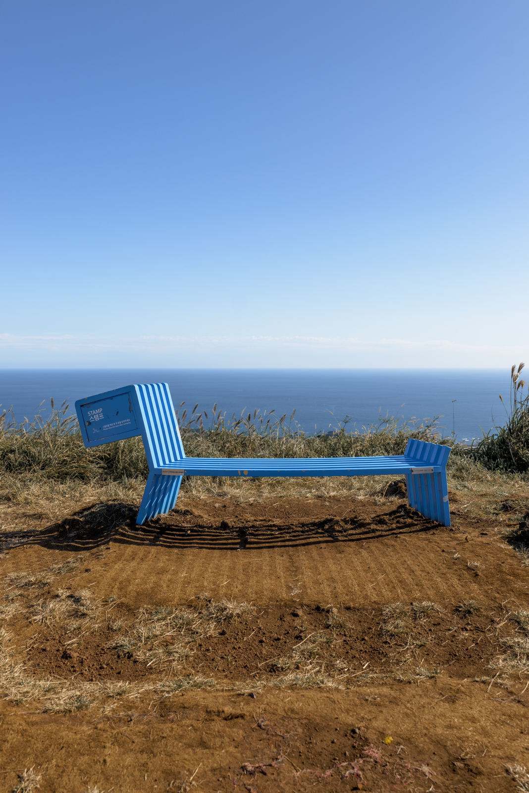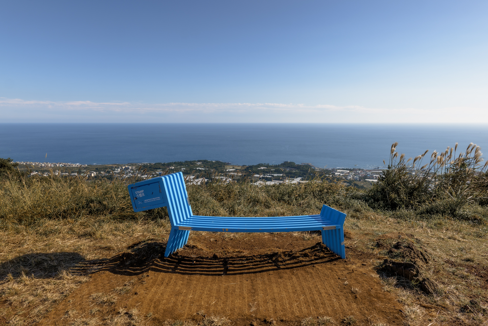 제주 군산오름에서 가장 높은 전망을 볼 수 있는 탐방로를 따라 걷는 길에는 제주 올레길 9코스 스탬프를 찍을 수 있는 의자 조형물이 설치되어 있으며 뒤로 보이는 서귀포 바다 풍경을 배경으로 사진을 찍을 수 있게 포토존 형식으로 제작되어 있었다.