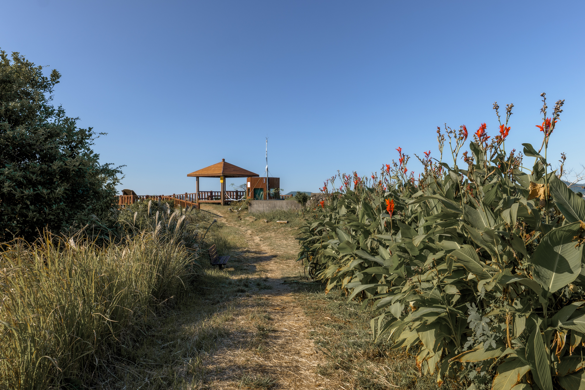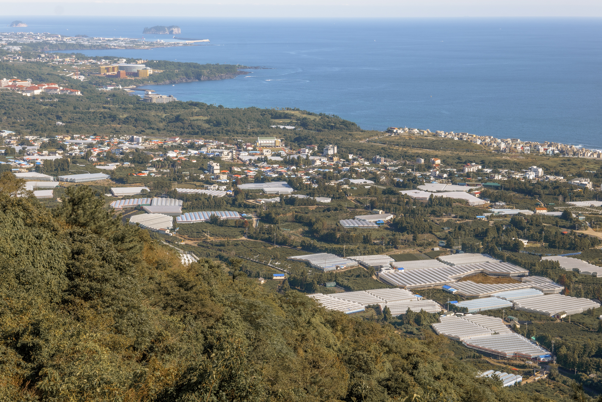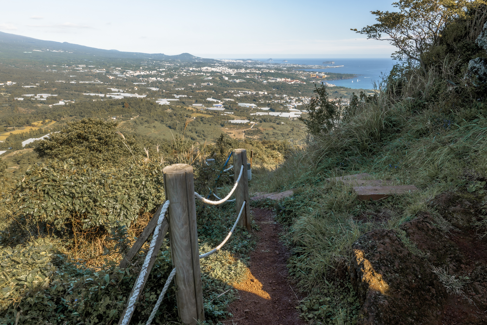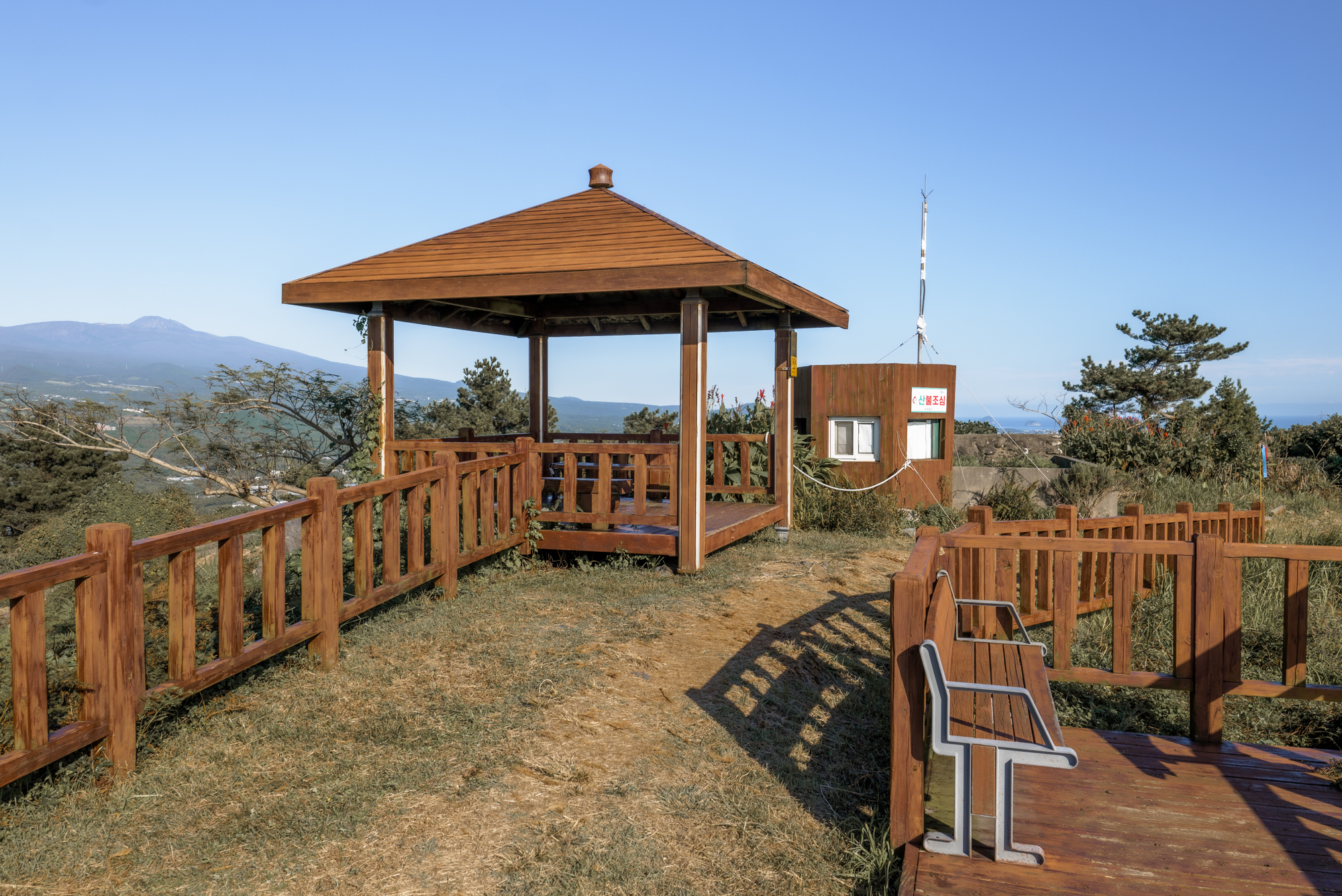 정상에 올라 오른쪽으로 보이는 쉼터에서는 가을 제주도 가볼만한곳 제주 군산오름의 전경을 볼 수 있는 전망대가 있다. 탐방로에는 제주 올레길 9코스를 안내하는 파란색 벤치 의자가 설치되어 있으며 옆으로는 제주 서귀포 중문관광단지 전망을 가까이에서 바라볼 수 있다.