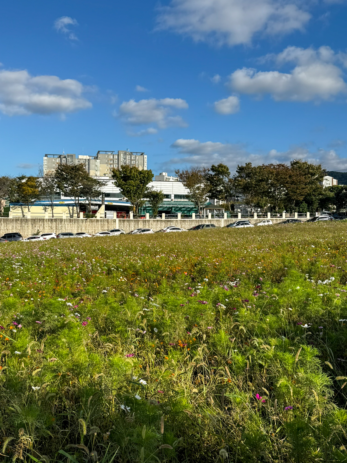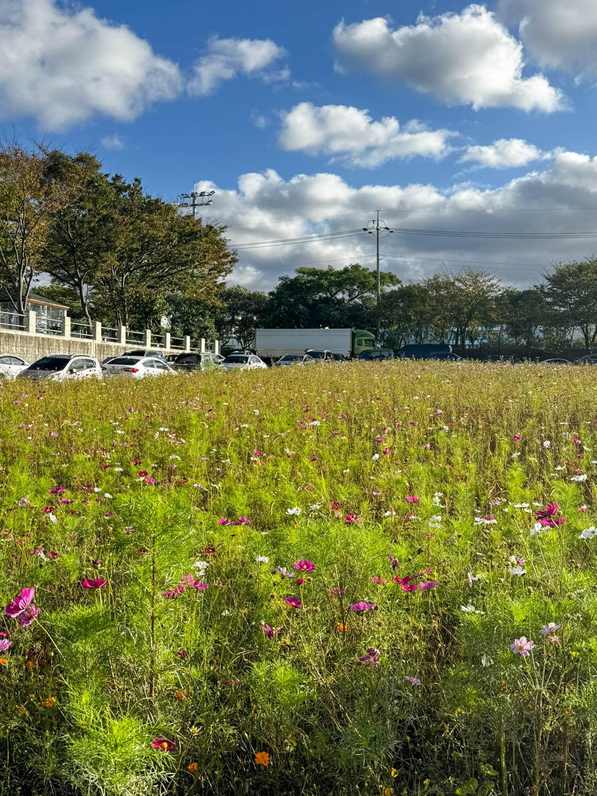 남자펌을 하기 위해 제주시 노형동 미용실 아우린헤어로 가는 길, 제주 우편집중국 뒤편에는 코스모스가 만발했고 날씨가 좋아 스마트폰 카메라로 풍경을 담아봤다.