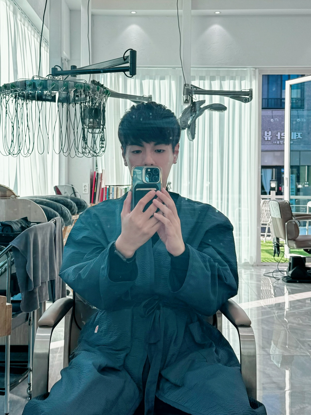 두 시간가량 진행된 남자펌이 끝나고 제주시 노형동 미용실 아우린헤어에 있는 전신거울에서 셀카 사진을 남겨봤다. 평소 앞머리를 옆으로 넘기는 스타일만 고집하다가 자연스럽게 떨어지는 헤어스타일로 바꿨는데 생각보다 더 마음에 들었고 머리 옆부분 또한 자연스러운 다운펌으로 깔끔했다.