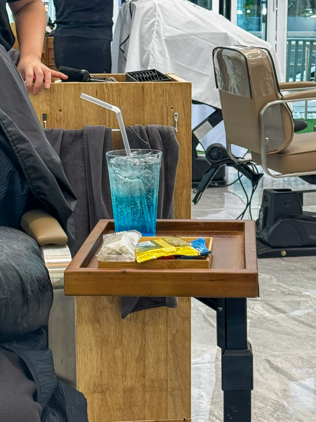 본격적으로 남자 머리펌을 하기 전에는 가운을 입고 제주 미용실 추천 아우린헤어 지훈 디자이너 선생님의 안내에 따라 의자에 앉았다. 머리펌을 하는 동안 마실 음료로는 커피, 녹차, 에이드 등이 있었고 원하는 메뉴를 선택할 수 있었다.