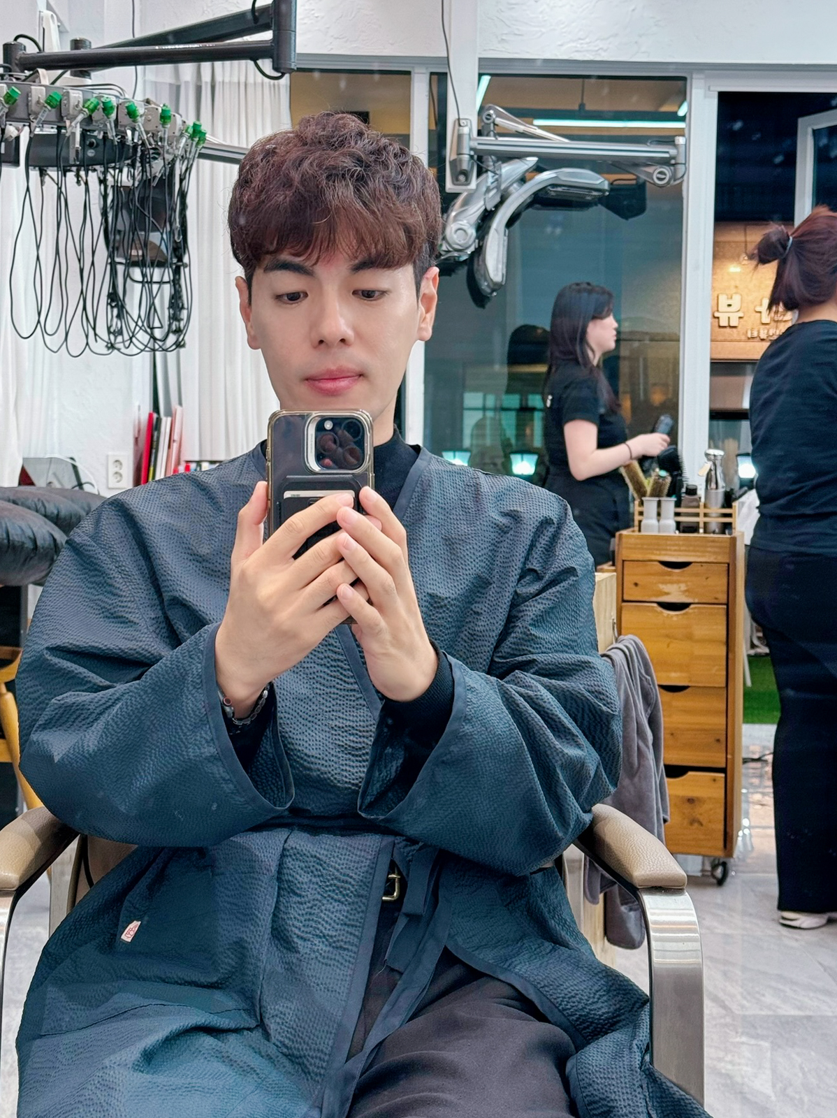 제주시 노형동 미용실 아우린헤어 지훈 디자이너 선생님이 말하길 옆머리를 다운펌해서 매번 자르지 않아도 깔끔하게 유지될 수 있다고 했고 머리 윗부분은 웨이브를 넣어 펌을 하면 좋을 것 같다고 하여 남자펌을 진행했다.