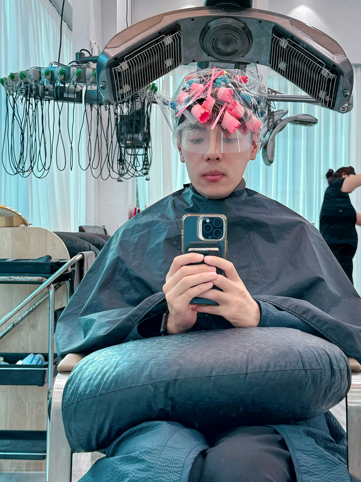이어 본격적으로 남자 머리펌을 했고 파마 롯드를 끼우고 에어롤 기계를 통해 열처리를 진행했고 전체적인 소요시간은 약 2시간 정도였다.