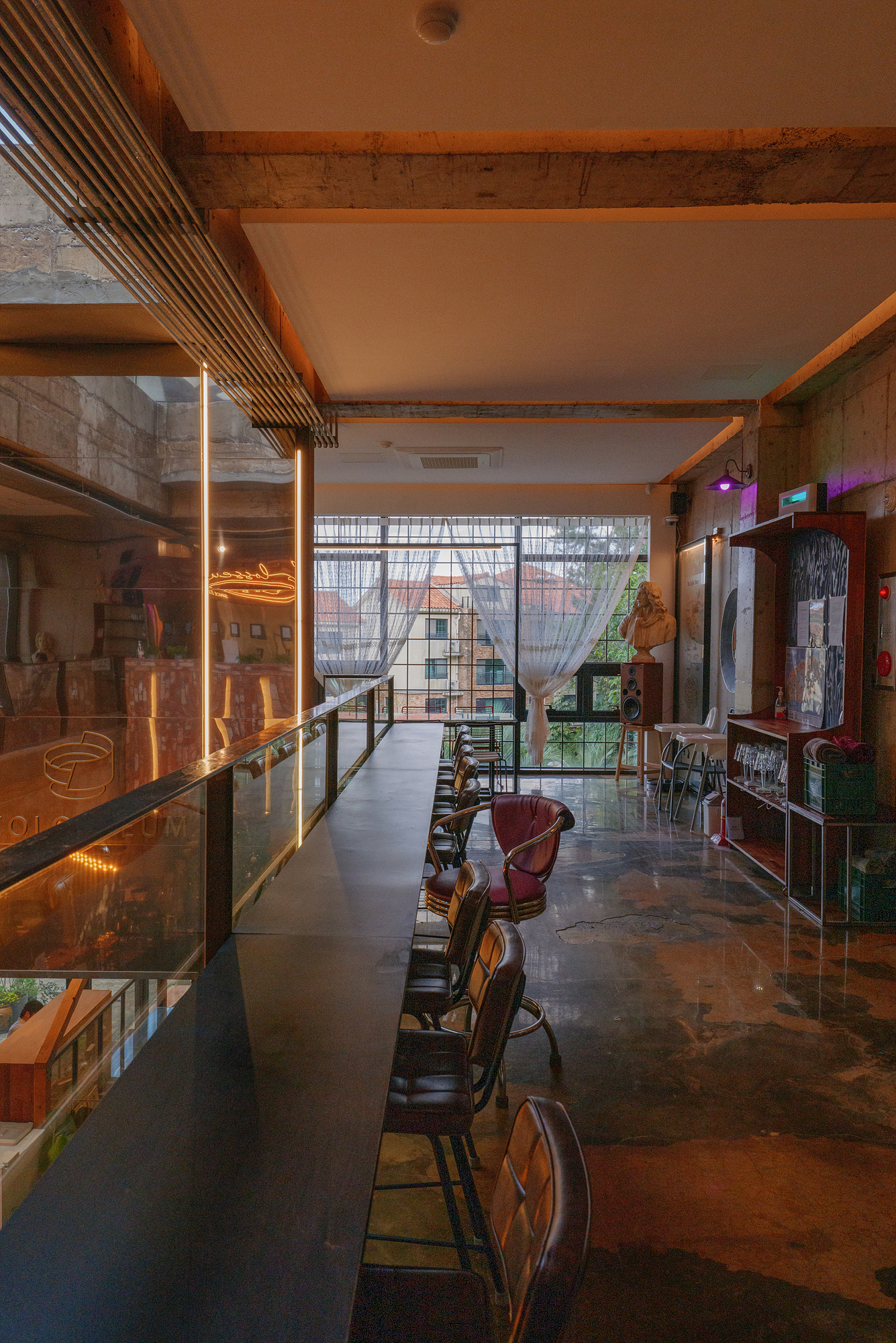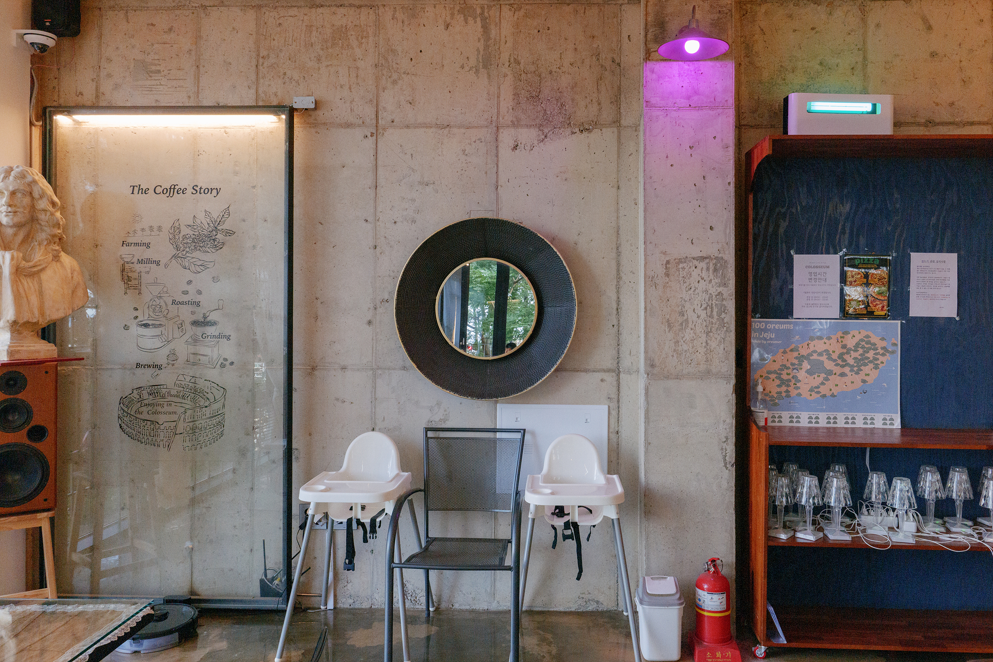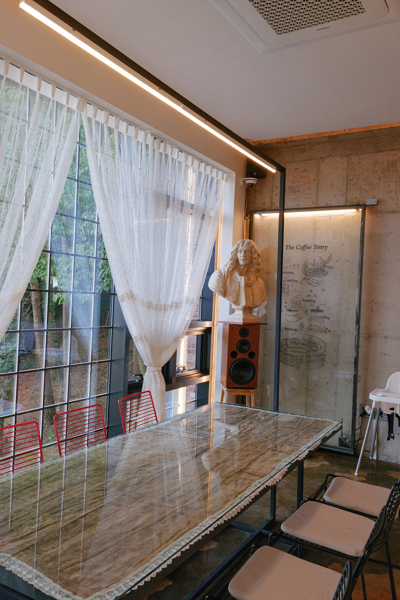 1층에는 편하게 앉을 수 있는 소파와 넓은 테이블이 있고 안쪽에 별도의 자리도 마련되어 있다. 또한 커다란 화분과 함께 여러 소품과 조각상, 조형물이 있어 이국적인 감성도 함께 전해졌다.