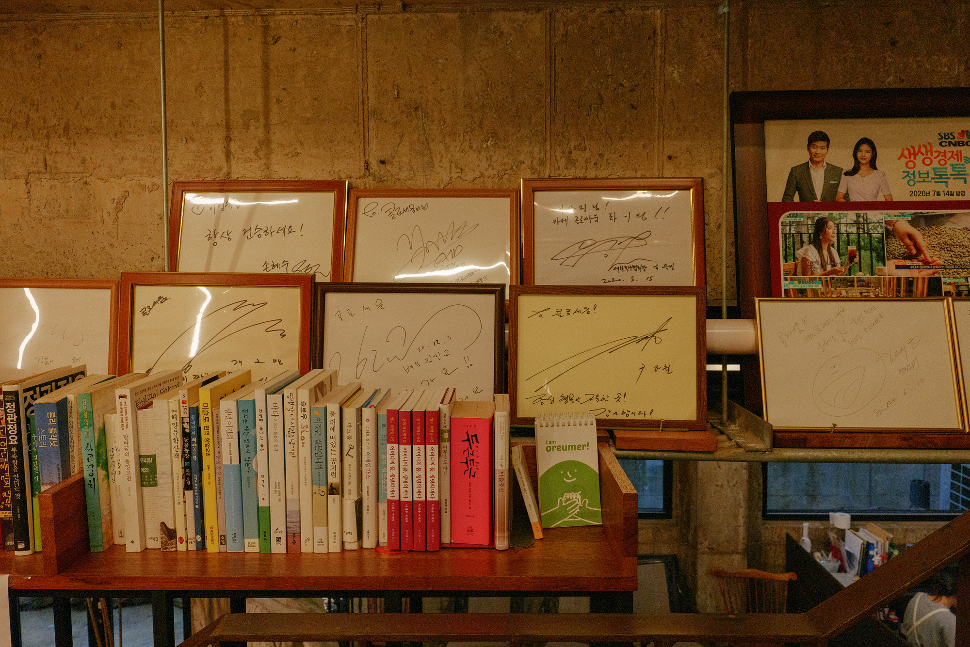 또한 양옆으로 여러 장르의 책이 진열되어 있었고 제주공항 근처 카페를 찾은 유명인들의 사인도 구경할 수 있었다. 조각상부터 그림과 꽃까지 여러 볼거리가 다양해 머무는 동안 심심하지 않았다.