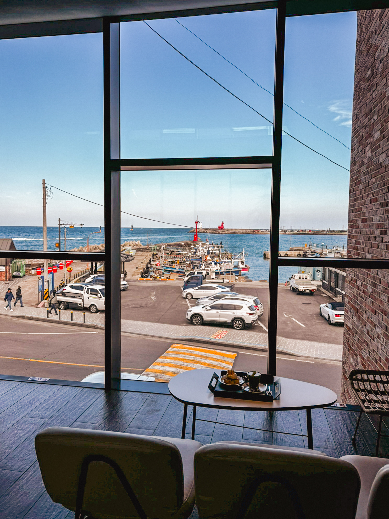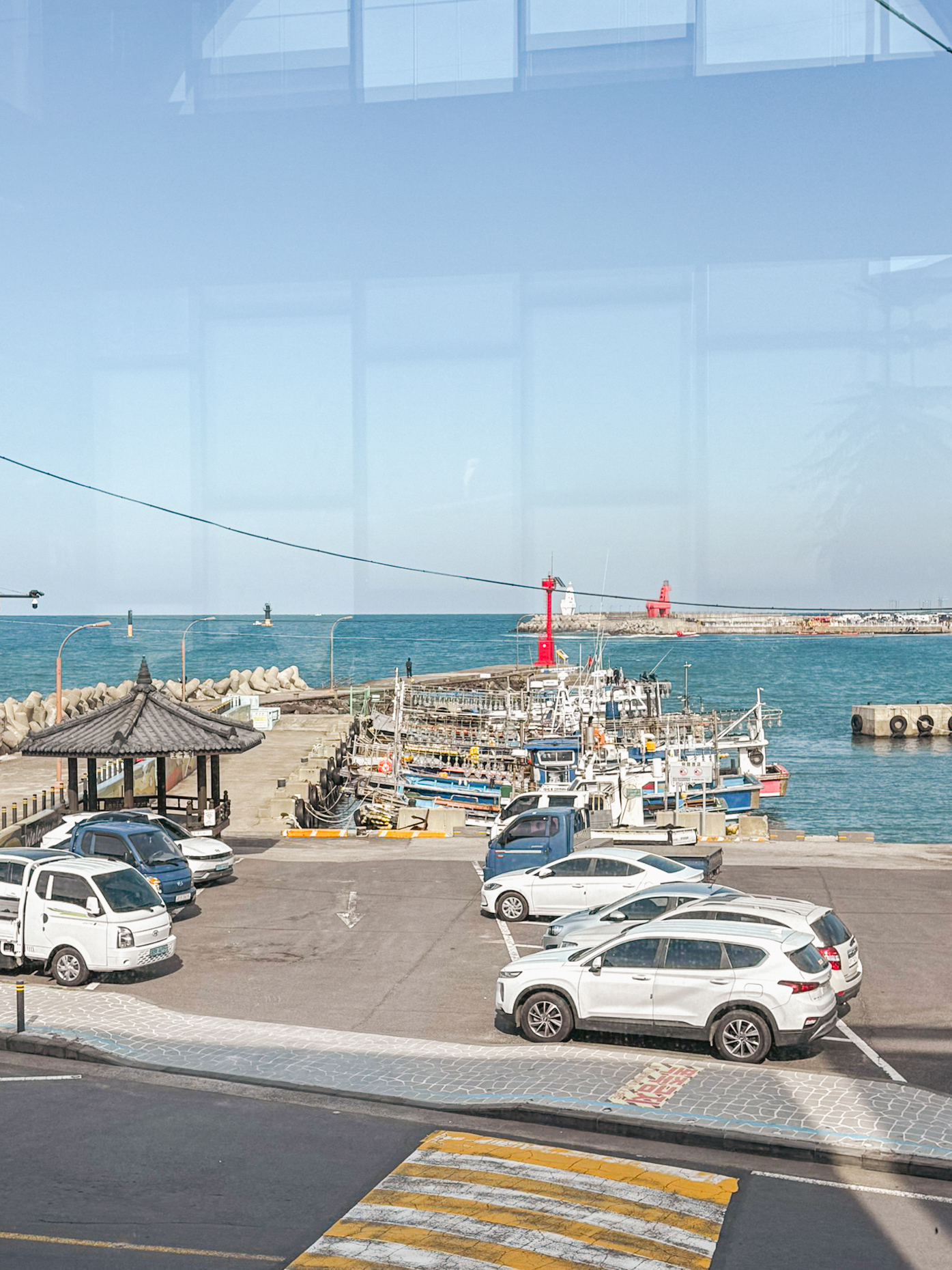 카페에는 따로 주차장이 없으나 매장 앞쪽과 맞은 편 도로 갓길과 현사포구 앞 주차장에 무료로 차를 세울 수 있어 렌트카나 자가용을 타고 가기가 편리해 여행 첫날이나 마지막날에 들리기 좋다.