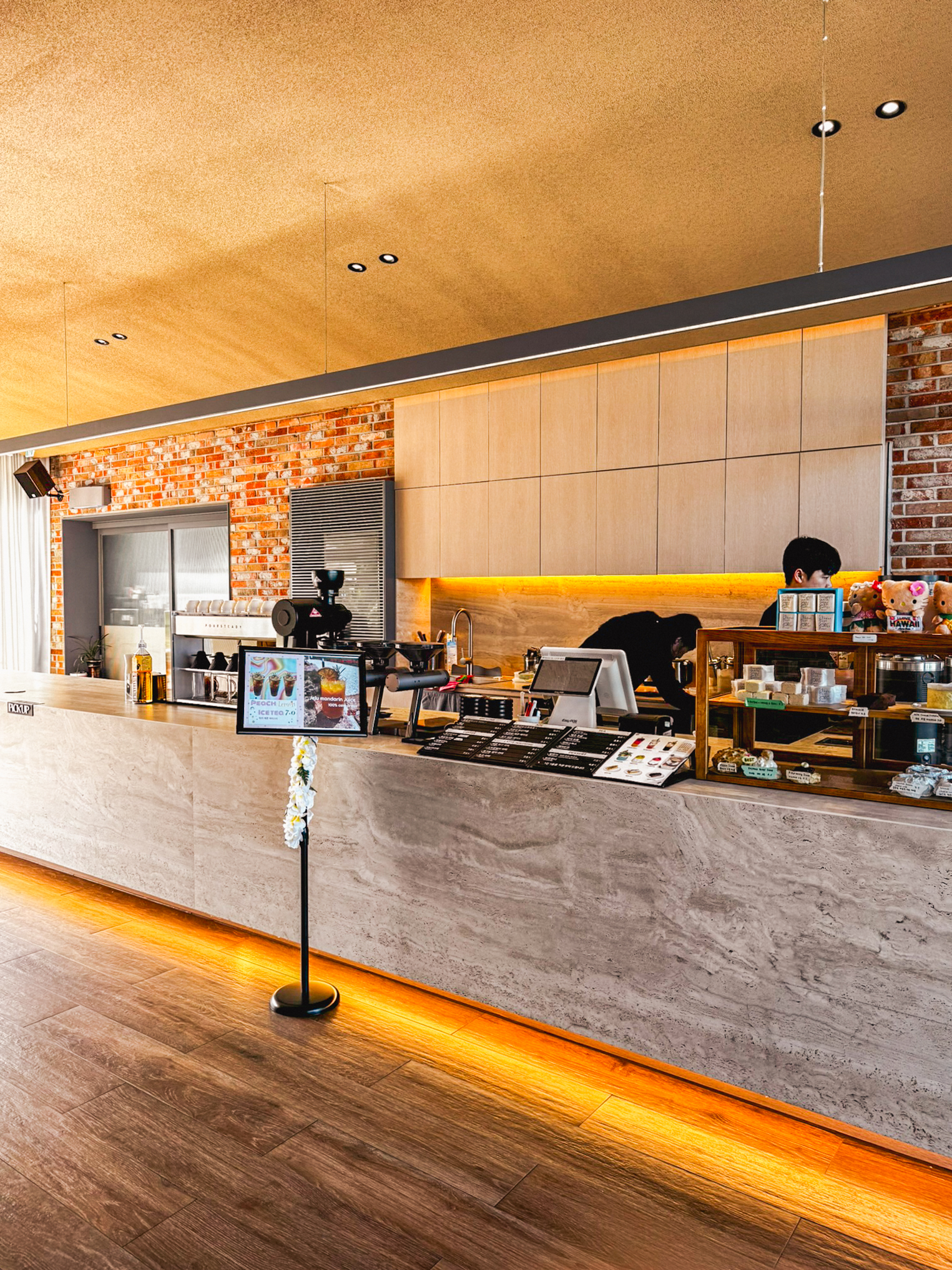 제주 오션뷰 카페 신상 1층은 카운터 앞으로 여러 명이 앉을 수 있는 넓은 테이블이 있으며 전체적으로 북유럽 감성과 모던한 느낌으로 따뜻한 분위기를 자아내고 있었다.