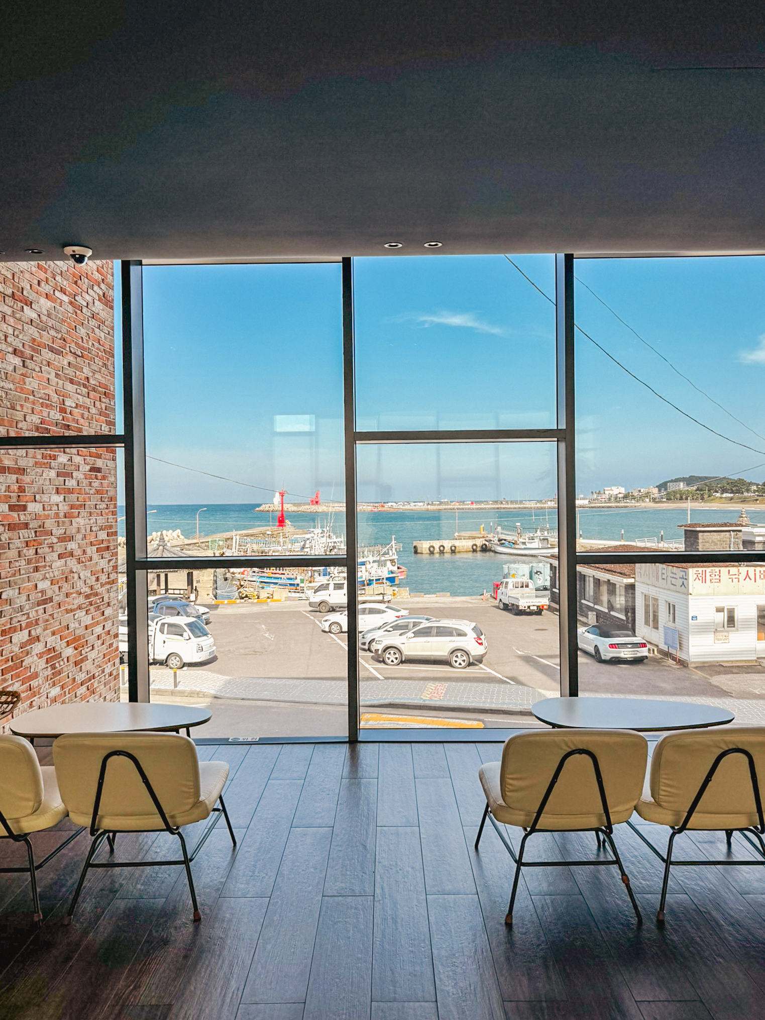 3명이 앉을 수 있는 3개의 테이블이 있었고 푸른 바다를 보며 커피나 디저트를 먹을 수 있는데 제주도 날씨가 좋지 않거나 비오는날에도 가기 좋은 베이커리 카페라 할 수 있었다.