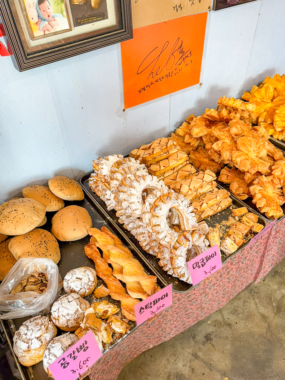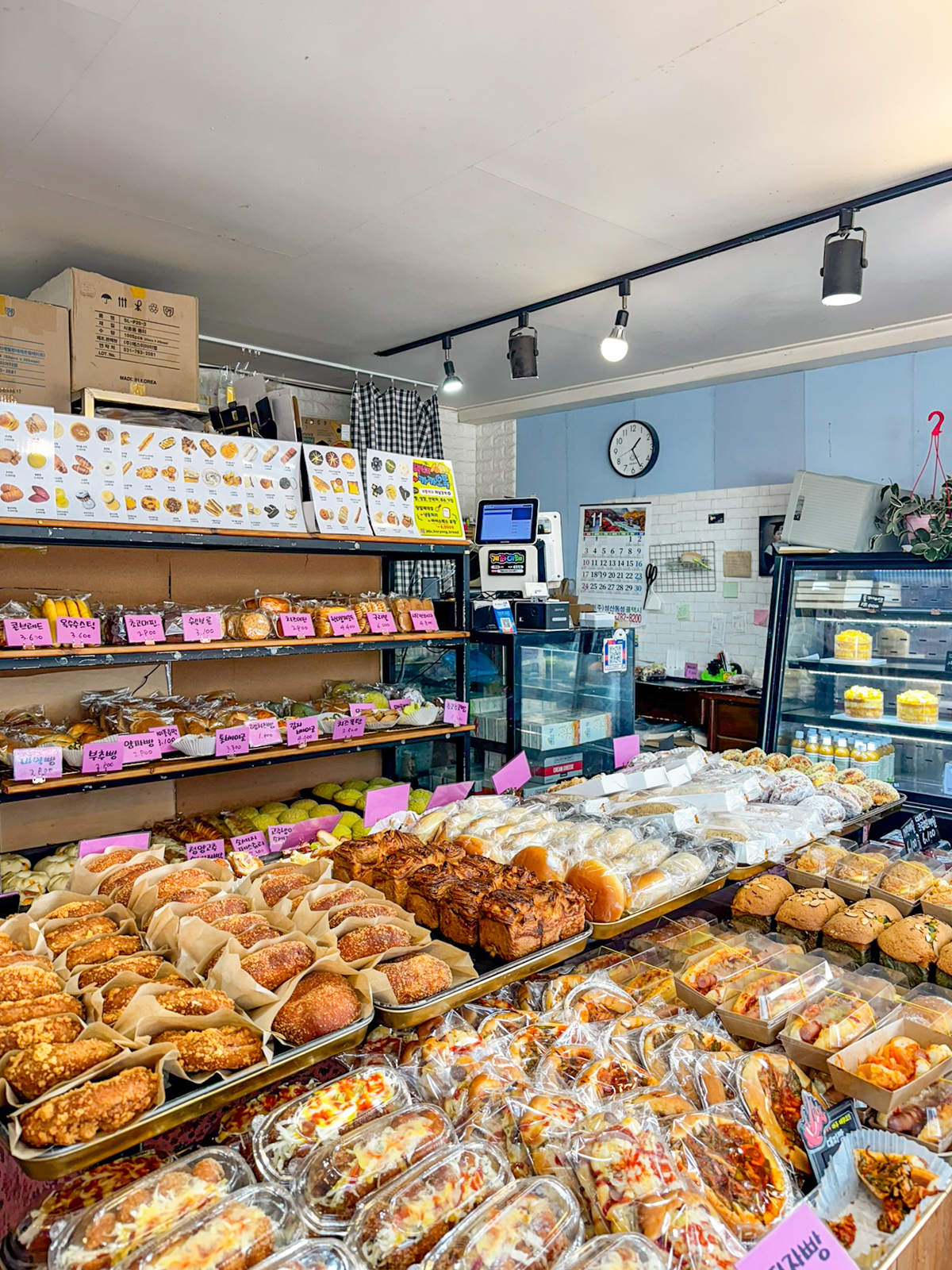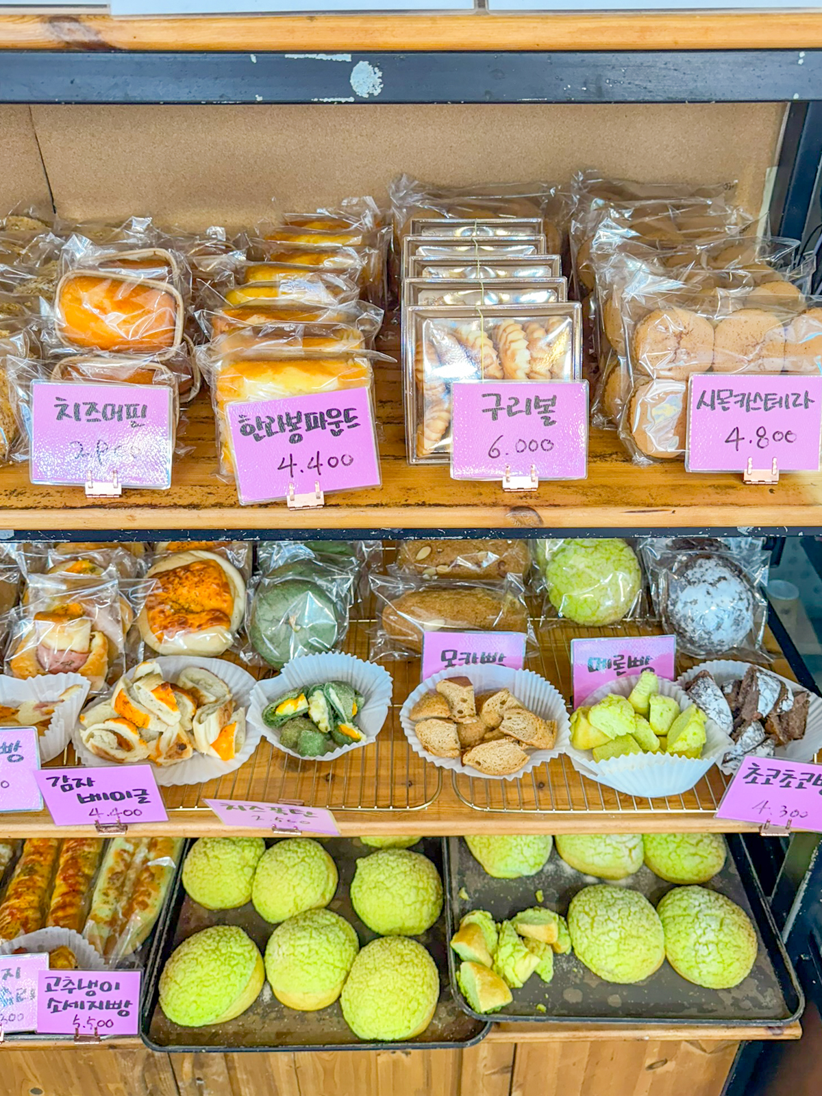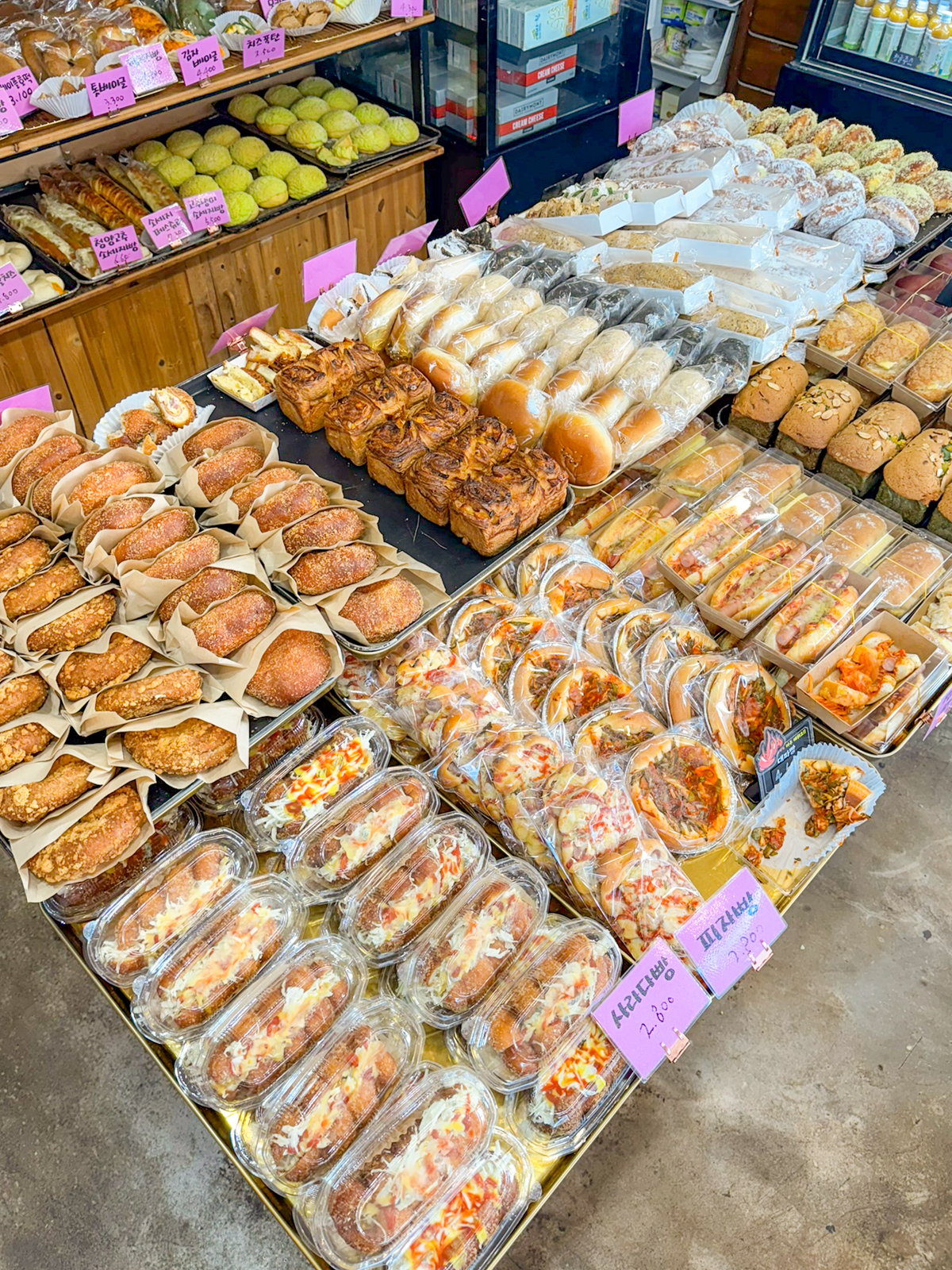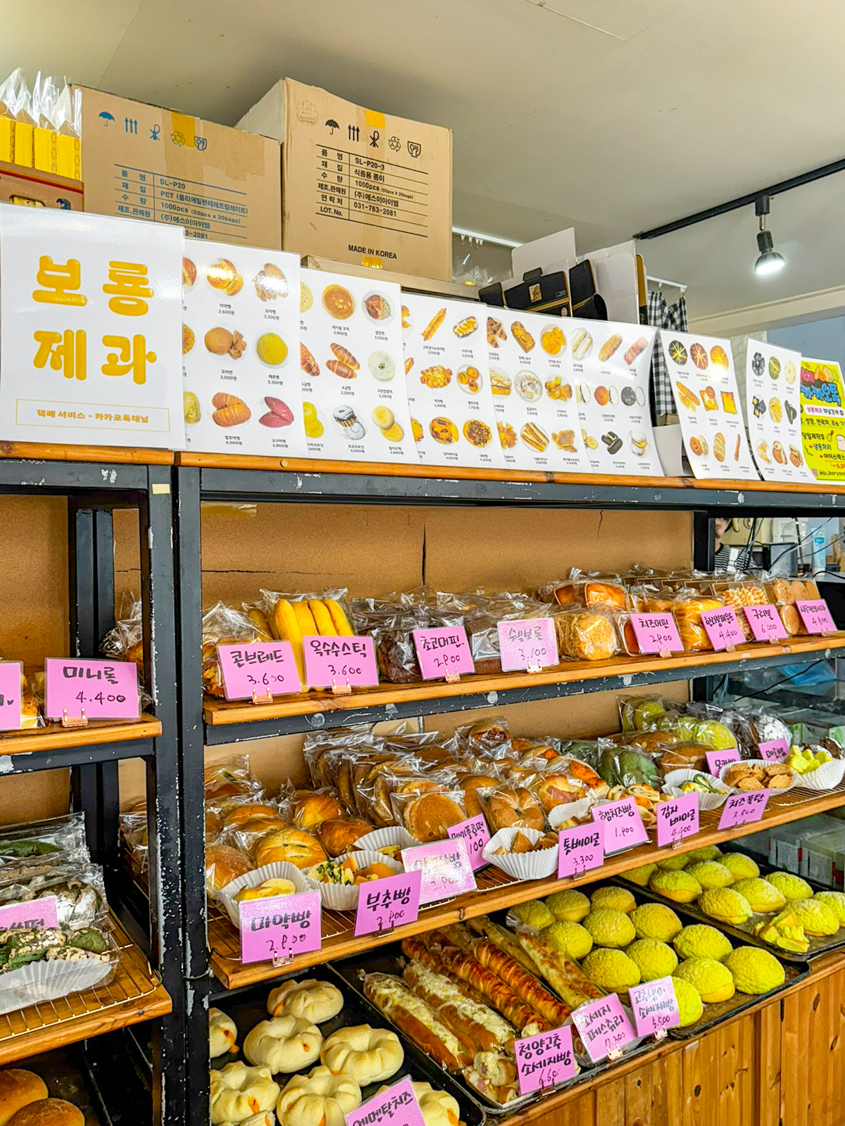 제주도 빵집 유명한곳 제주 보룡제과에는 바게트, 파이 외에도 크로와상, 소금빵, 파운드, 페스츄리, 콘브레드, 옥수수스틱, 머핀, 카스테라, 마약빵, 부추빵, 베이글, 호떡, 햄치즈빵, 베이글, 메론빵, 모카빵 등 최근에 가본 베이커리 중에서도 가장 종류가 많아 무엇을 먹을지 고민하게 만들 정도다.