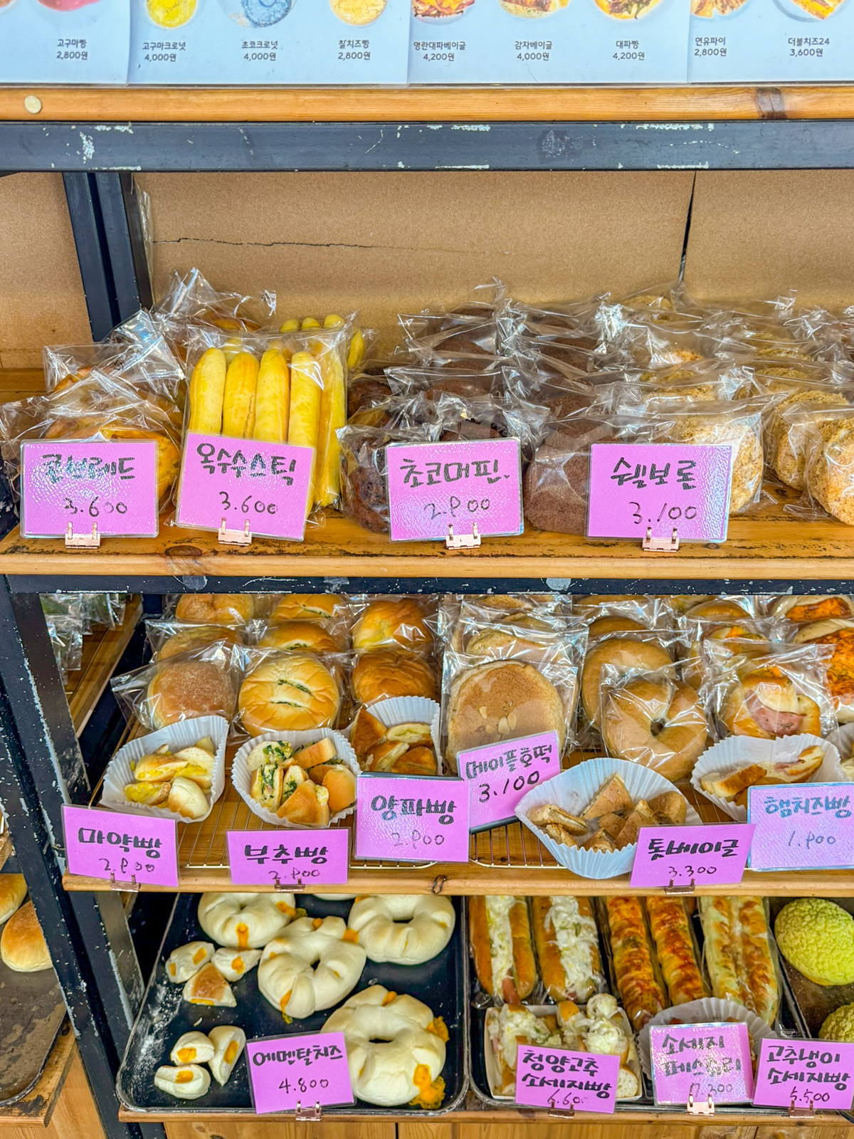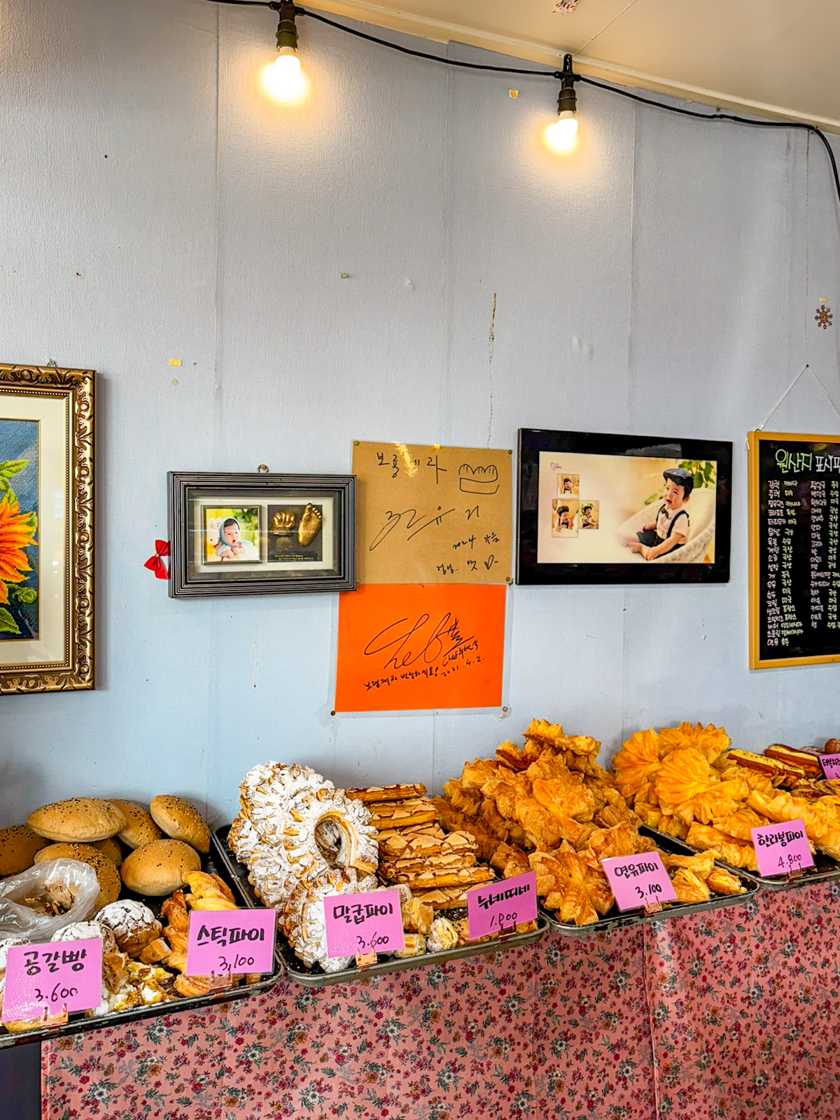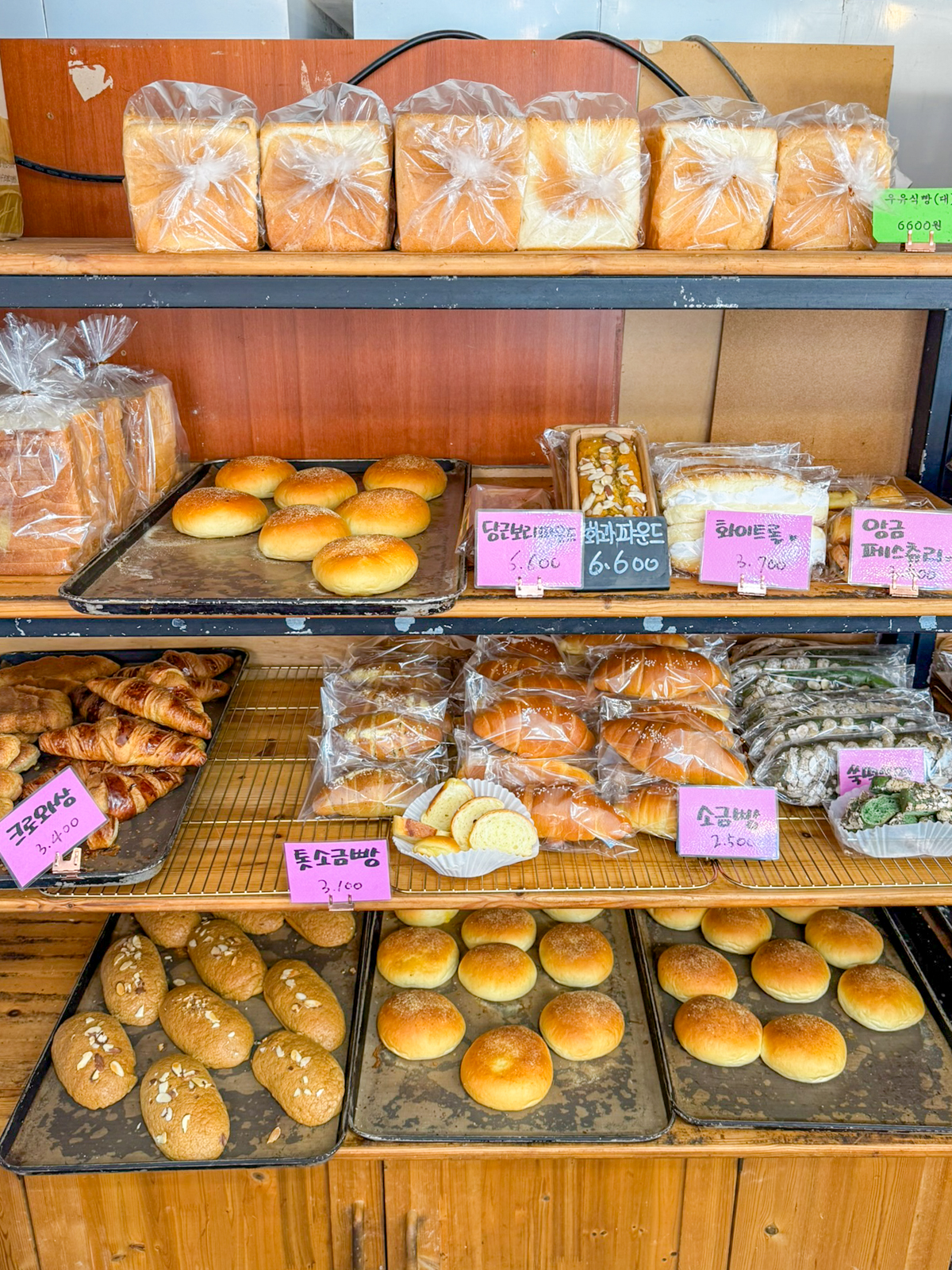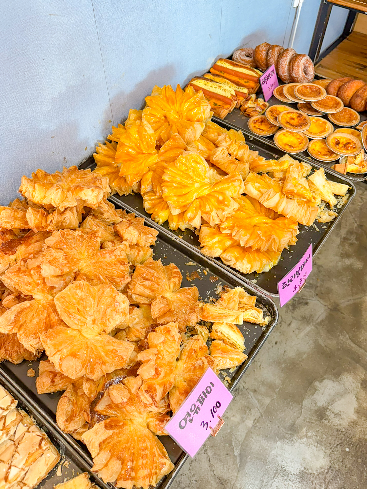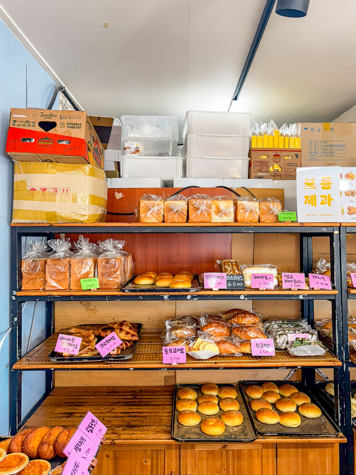 제주도 빵집 유명한곳 제주 보룡제과에는 바게트, 파이 외에도 크로와상, 소금빵, 파운드, 페스츄리, 콘브레드, 옥수수스틱, 머핀, 카스테라, 마약빵, 부추빵, 베이글, 호떡, 햄치즈빵, 베이글, 메론빵, 모카빵 등 최근에 가본 베이커리 중에서도 가장 종류가 많아 무엇을 먹을지 고민하게 만들 정도다.