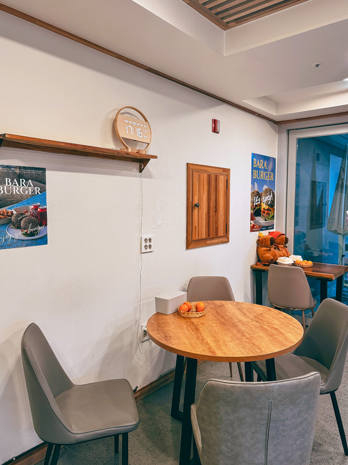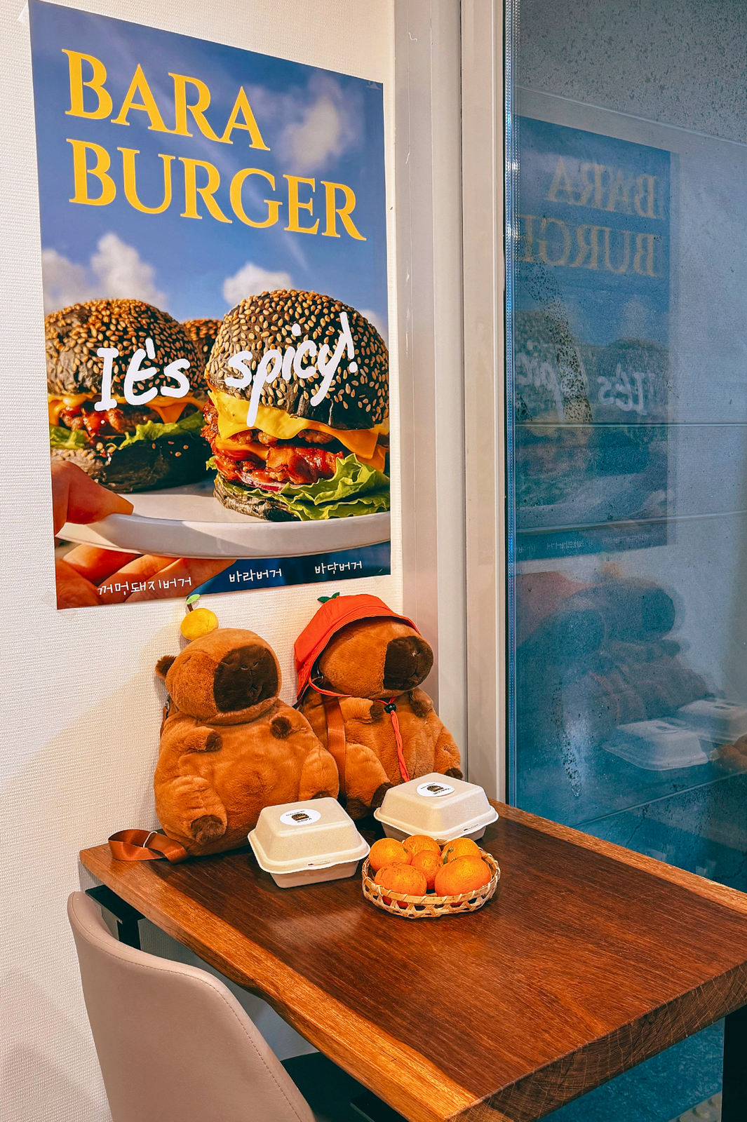 제주공항 근처 수제버거 바라버거는 테이블마다 작은 바구니에 감귤이 놓여 있고 수제버거를 먹으러 갔다가 무료로 귤도 맛볼 수 있다. 혼밥을 할 경우 창가 자리에 앉아 스마트폰을 보며 편하게 식사도 할 수 있는 장점을 가지고 있었다.