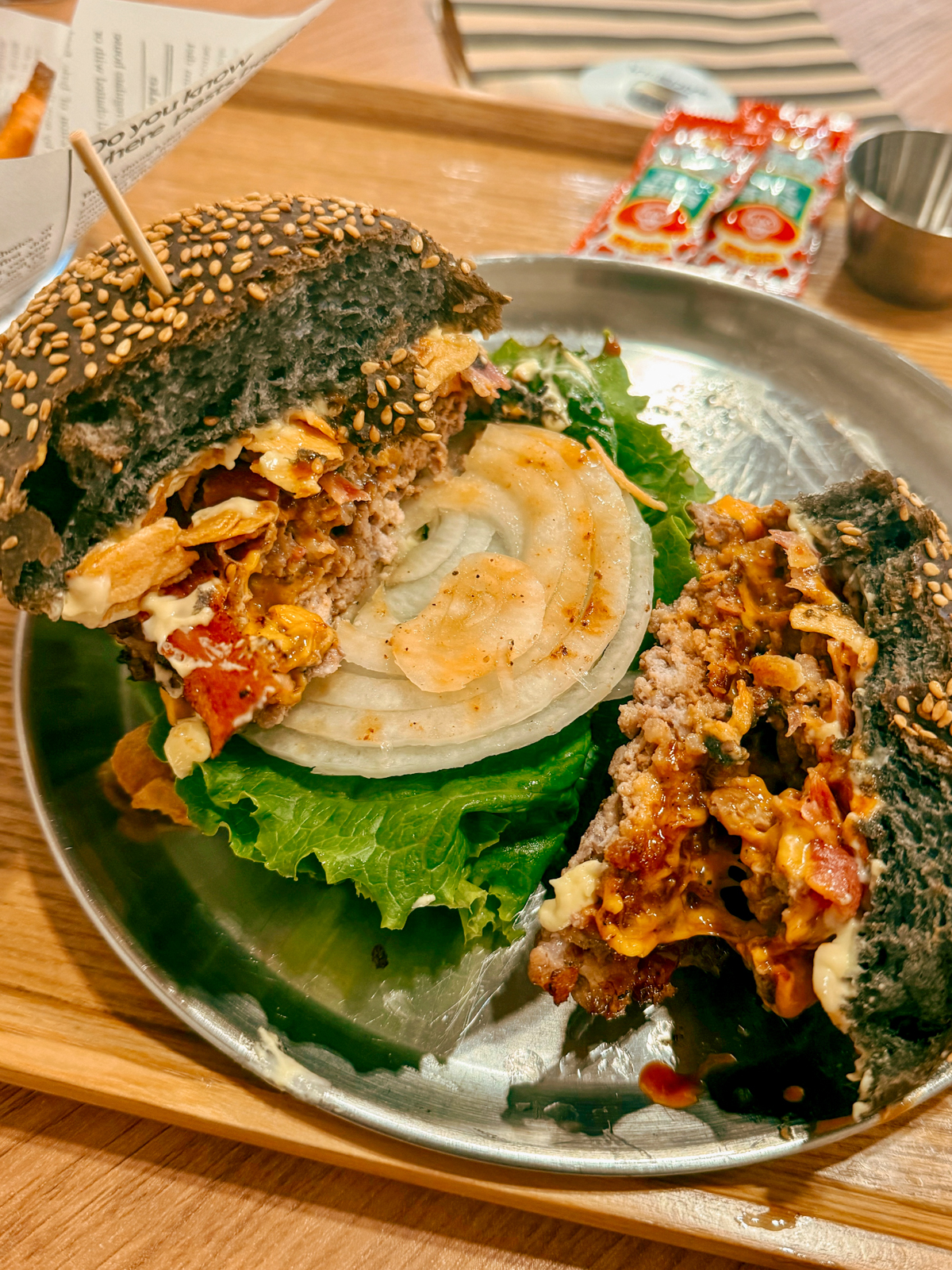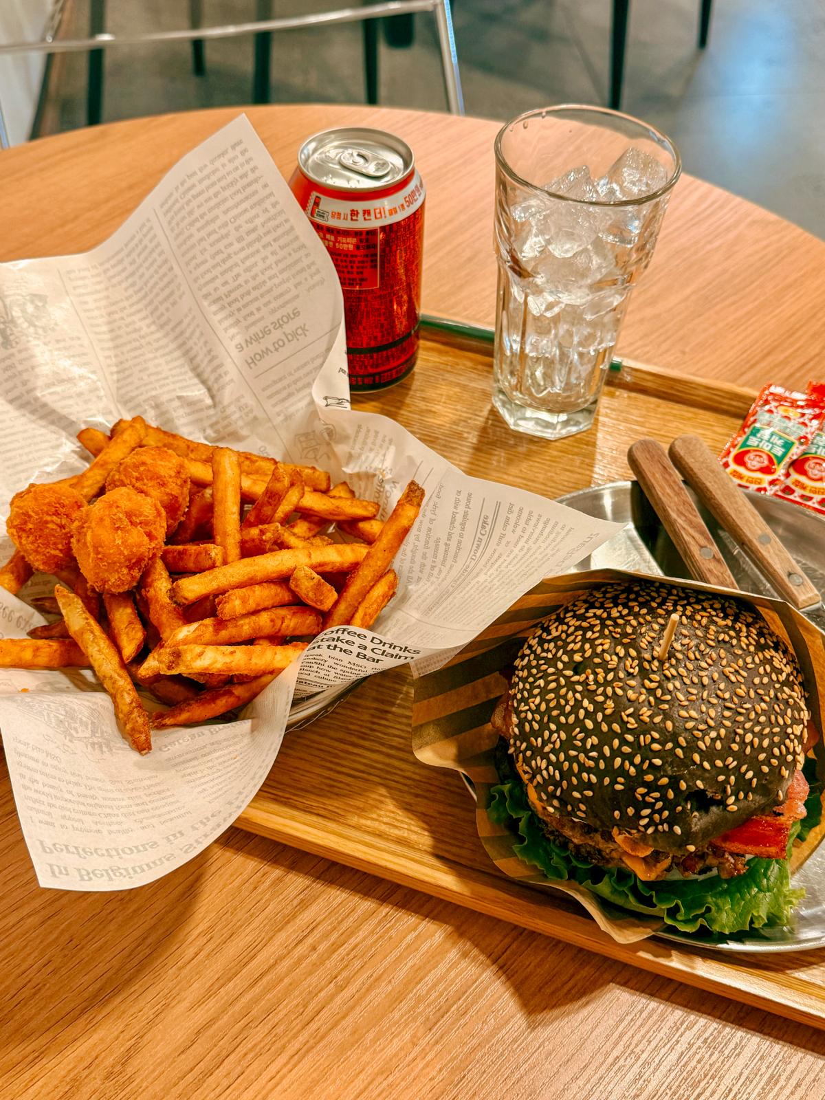 제주 바라버거에 방문했던 날에는 저녁식사 혼밥으로 14,900원짜리 더블 꺼멍 흑돼지버거를 주문했다. 주문 후 음식이 나오기까지 약 10분 정도 소요됐으며 두툼한 버거와 함께 감자튀김, 새우튀김과 음료수가 포함되어 있었다.