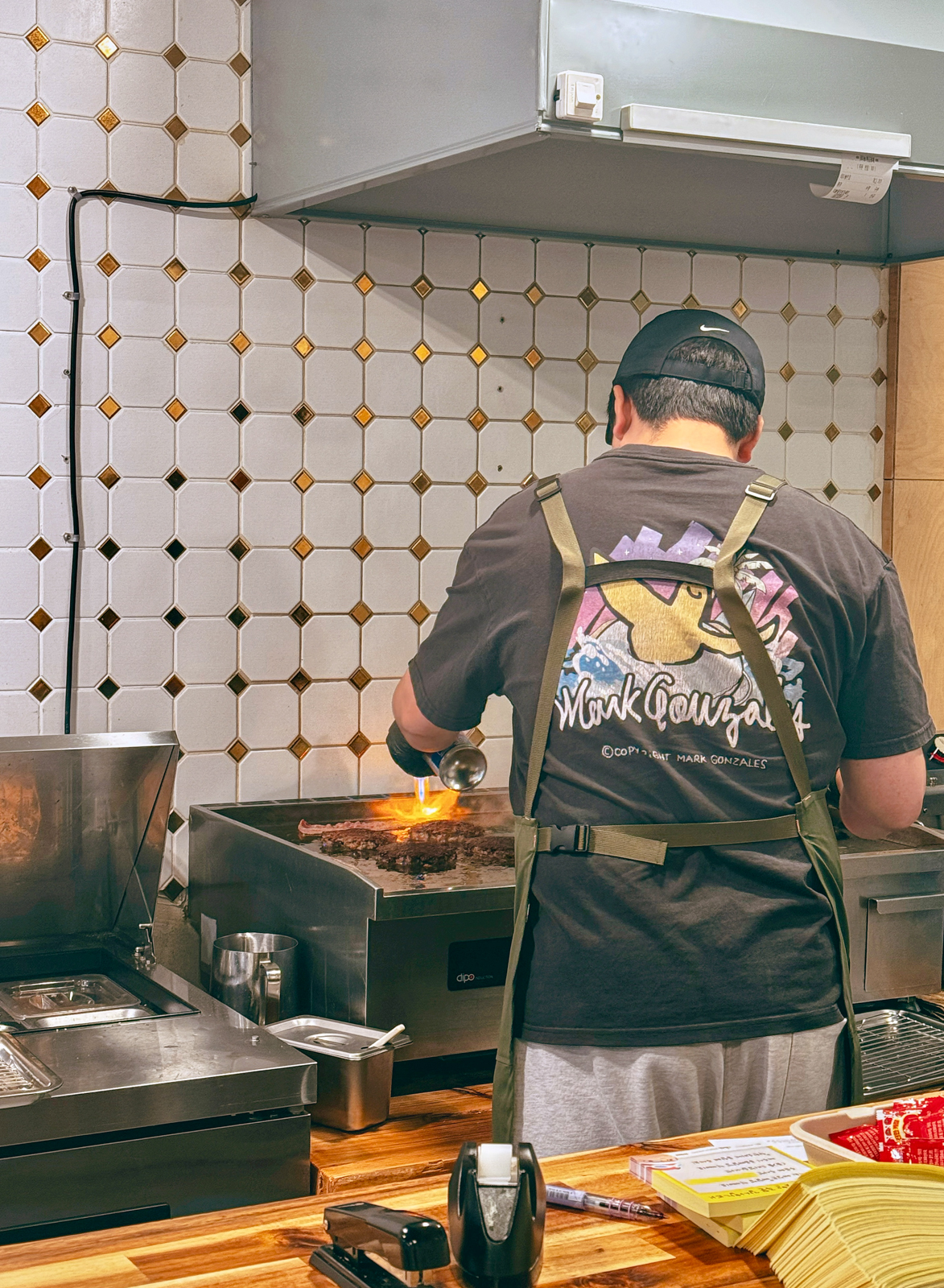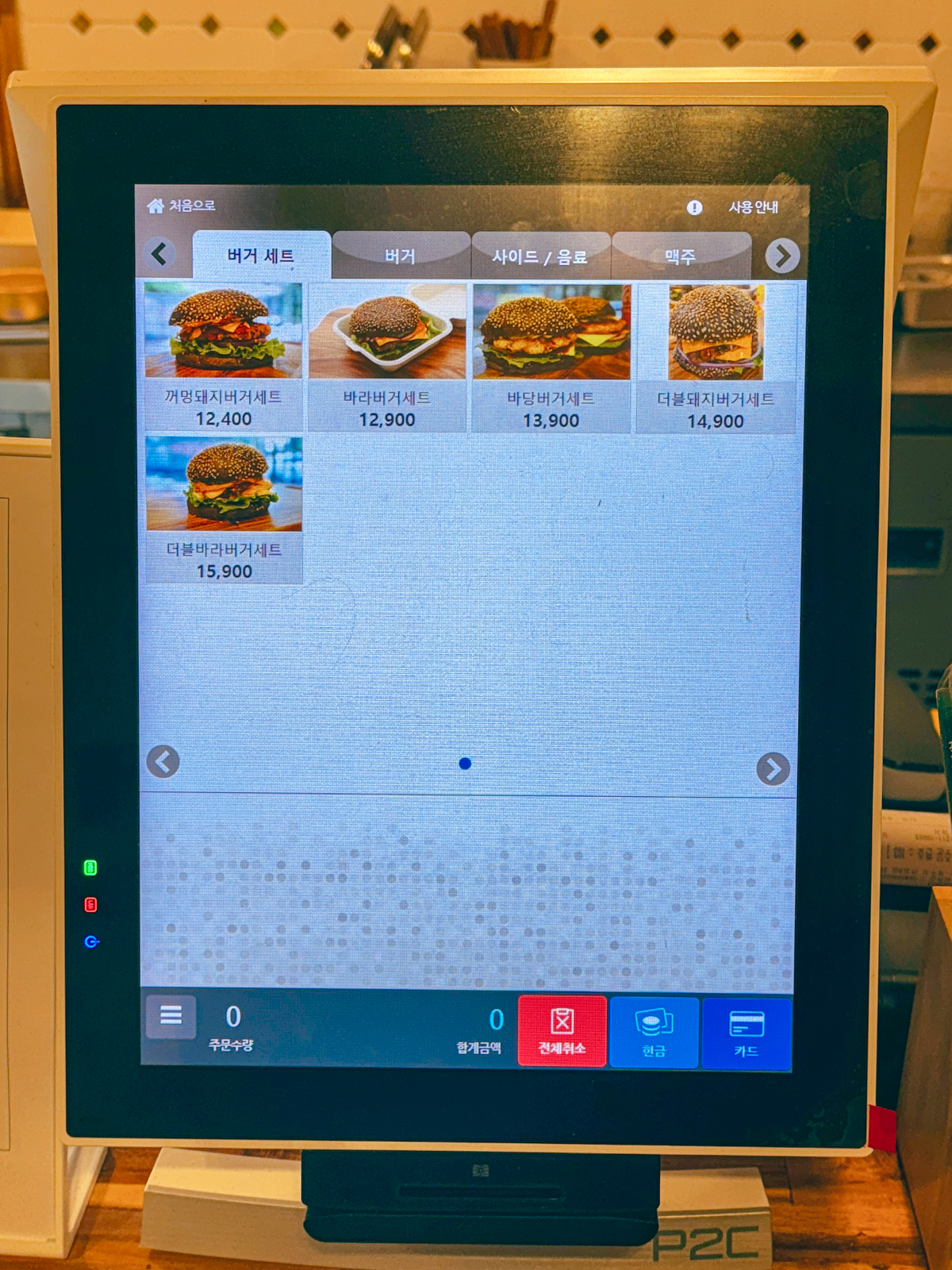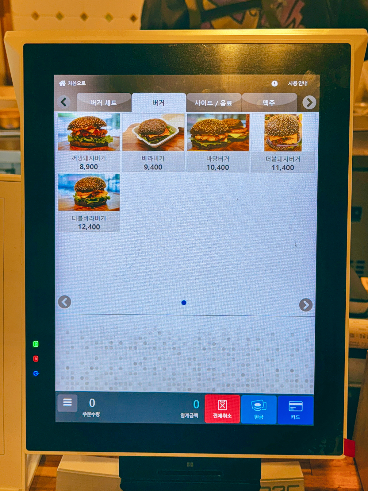 제주공항 근처 수제버거 맛집 바라버거에서는 키오스크를 통해 메뉴를 주문하면 즉석에서 버거를 만드는 모습도 볼 수 있다. 흑돼지, 소고기 패티를 굽는 과정에서는 화려한 불쇼도 구경할 수 있어 아이들과 함께 가기 좋은 음식점이기도 하다.