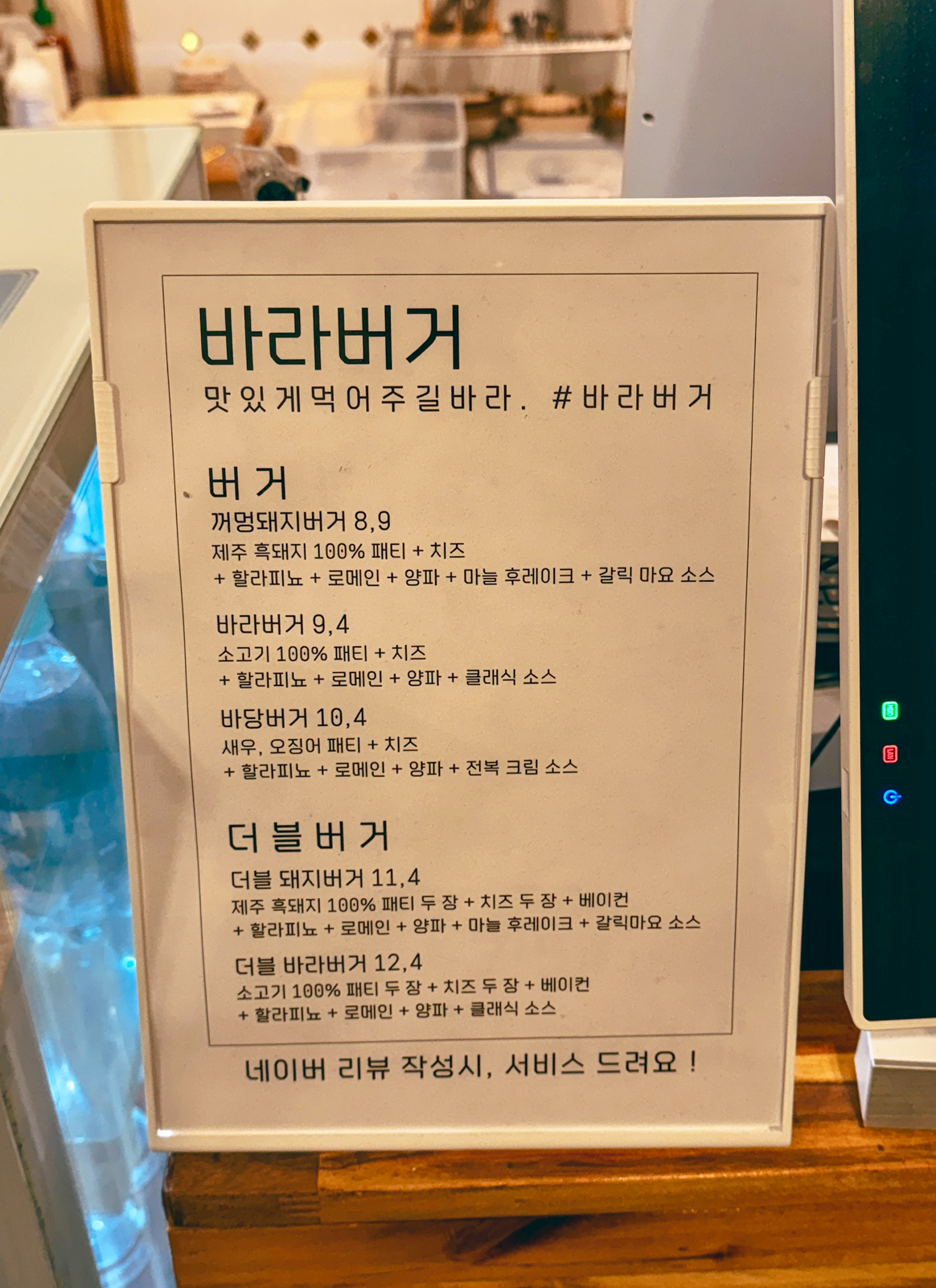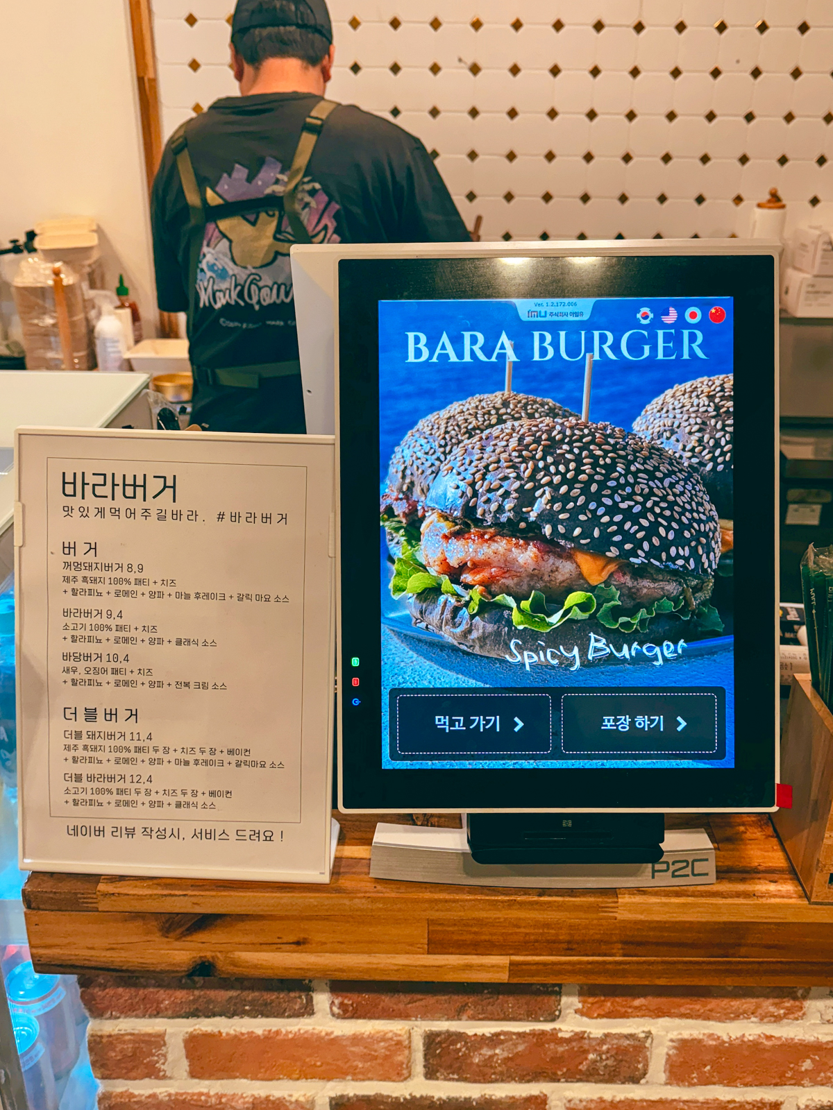 작년 초 처음 방문했던 바라버거는 제주산 흑돼지, 미국산 소고기 등심, 새우 오징어 전복소스를 담아 직접 만든 수제버거를 매장에서 먹거나 배달, 포장할 수 있는 곳이다.