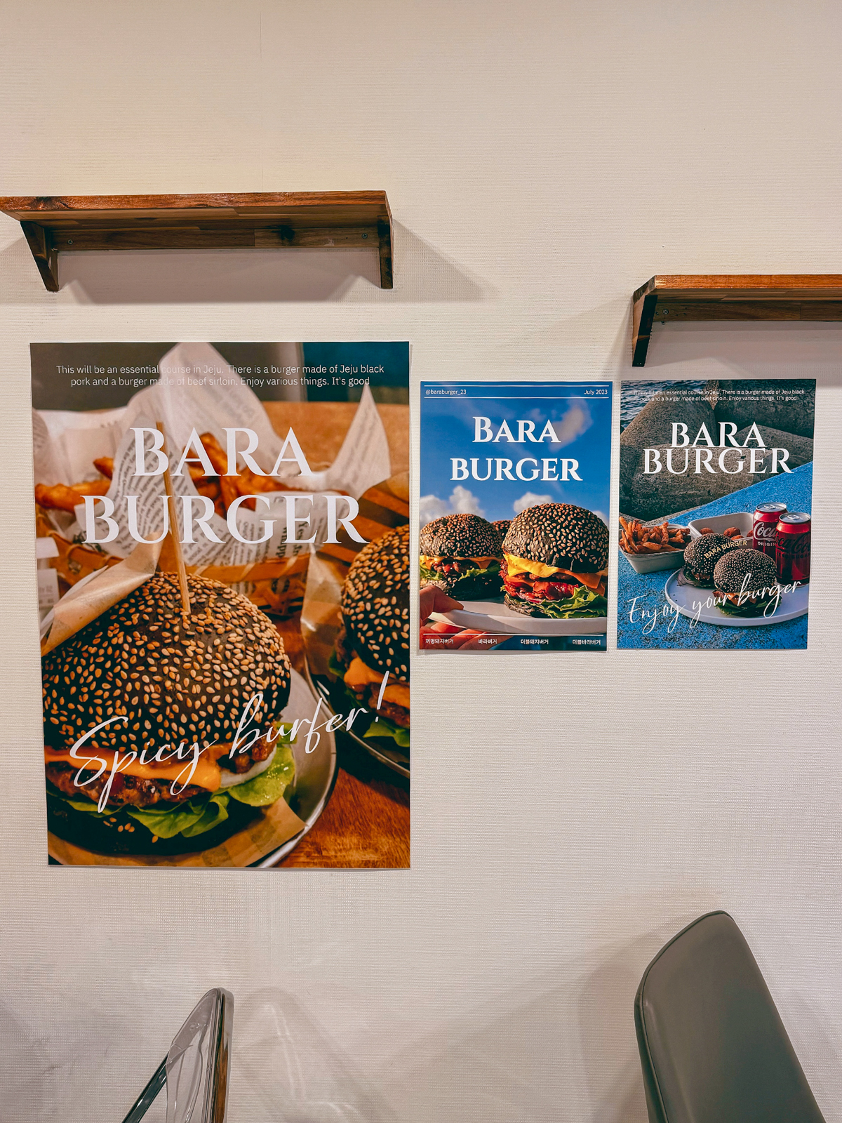 제주 수제버거 맛집답게 바라버거에는 한쪽 벽면에 이곳에서 맛볼 수 있는 흑돼지버거, 소고기버거, 바당버거를 담은 포스터 사진이 있으며 겨울철에는 히터가 틀어져 따뜻한 공간에서 머물며 버거를 먹기에도 좋은 환경을 갖췄다.