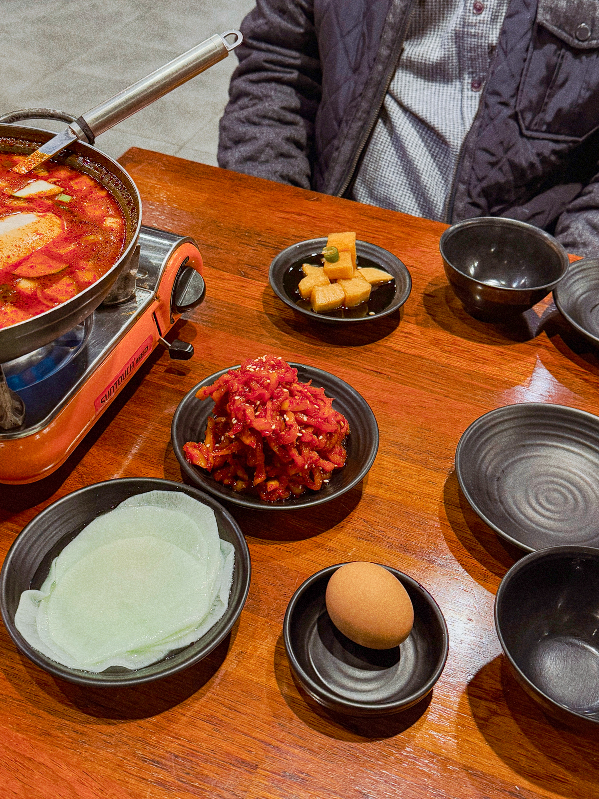 메뉴를 주문하고 기다리면 버너와 함께 커다란 냄비에 커다란 순두부가 들어 있는 찌개가 나오는데 국물이 진하고 맛있어서 술안주로 제격이었다.