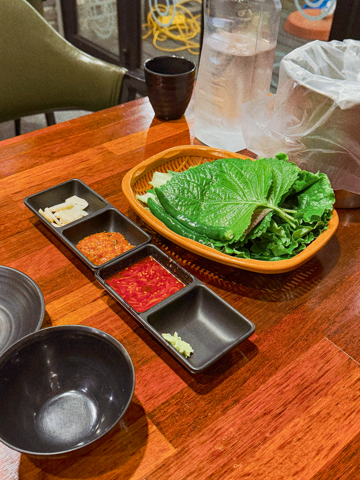 밑반찬으로는 제주 족발과 보쌈에 곁들일 수 있는 쌈과 된장, 새우젓, 와사비 소스가 나오며 쌈무와 아삭한 양파장아찌도 나와 새콤하게 음식을 먹을 수 있었다.