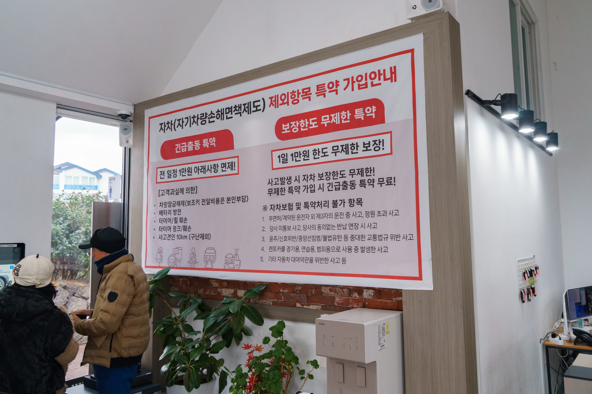 제주속으로 홈페이지에서 차를 대여할 때는 차종에 따라 200~400만 원 한도의 자차 보험이 포함되어 있어 사고 시 보장을 받을 수 있으며, 필요에 따라 보상한도 무제한 특약 보험을 가입해 추가요금없이 사고에 대비할 수 있어 더욱 안전하다.