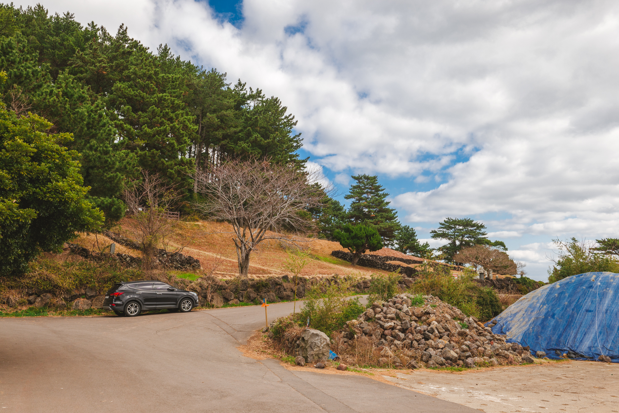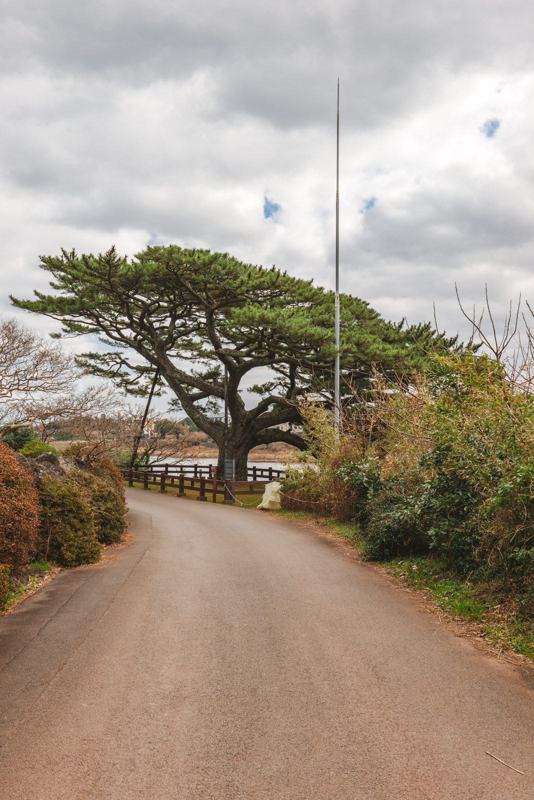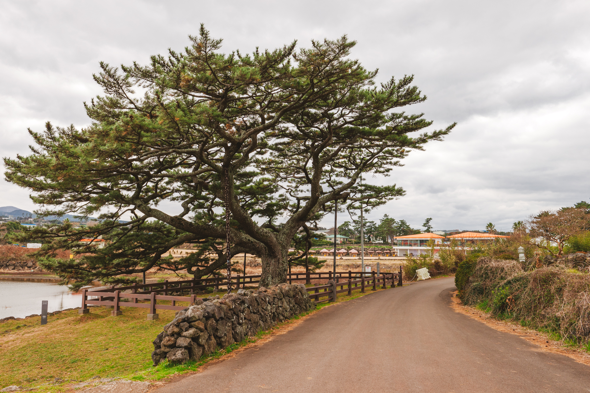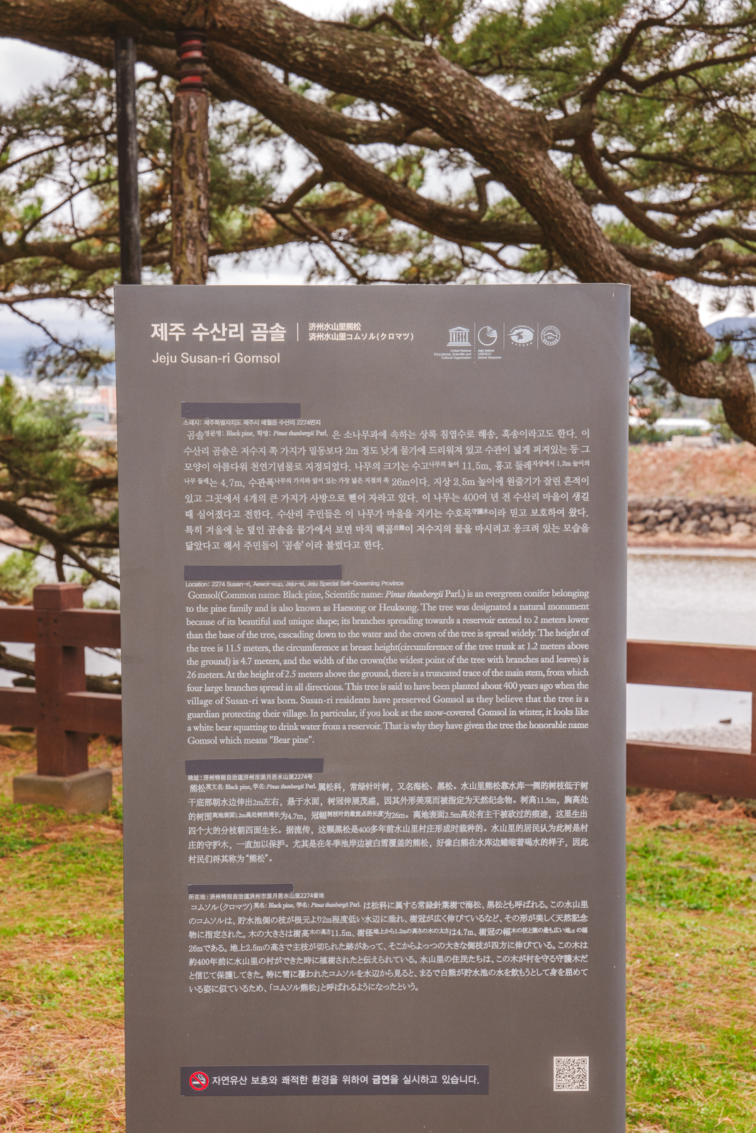 제주 애월 가볼만한곳 수산봉 입구 앞에는 약 500년 전에 심은 나무이자 천연기념물 제441호로 지정된 높이 11.5m짜리 곰솔을 볼 수 있는데 이곳에 가서 직접 보면 웅장한 분위기에 압도된다.