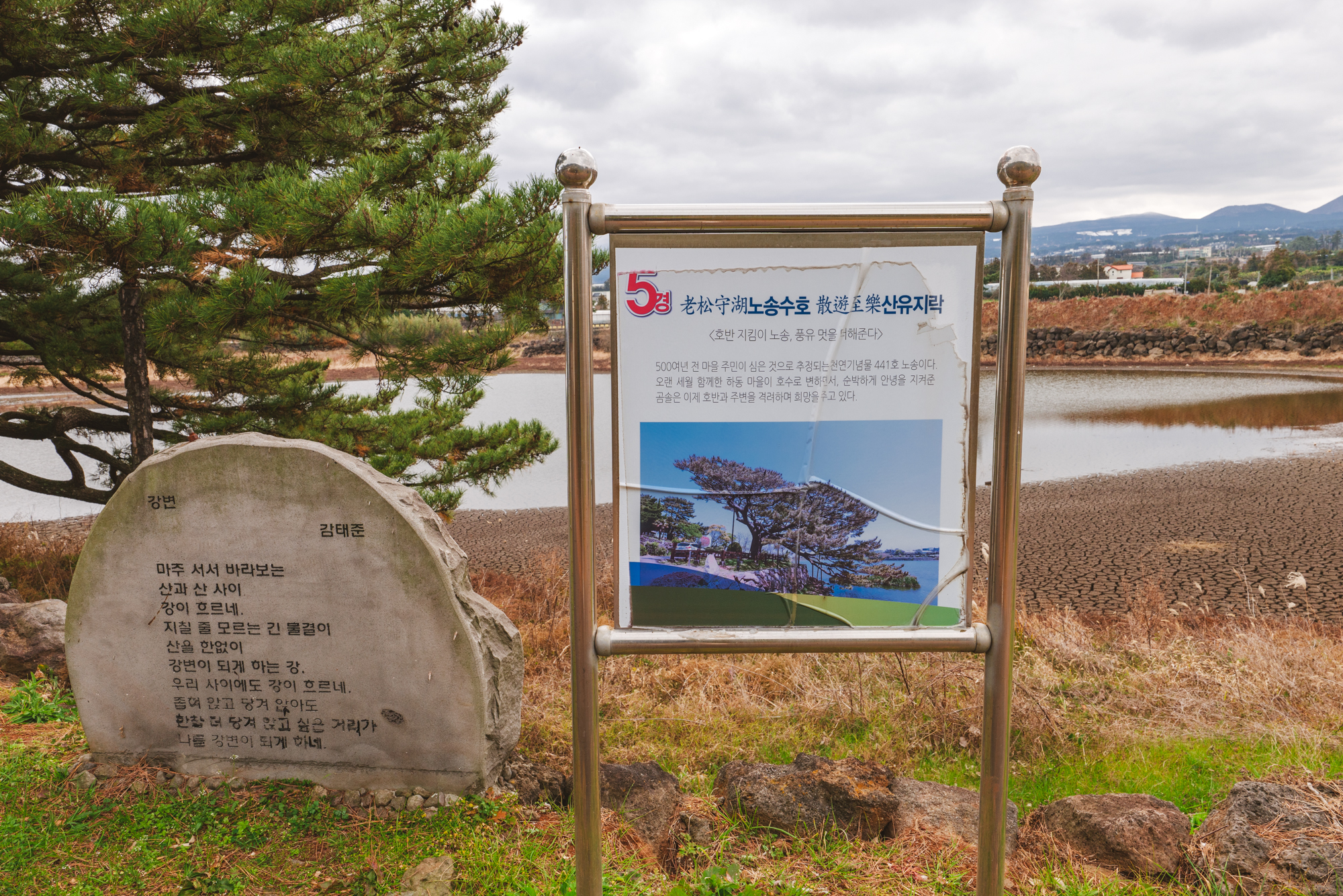 제주 수산리 곰솔 나무 옆으로는 인공저수지를 한눈에 볼 수 있는 공간이 마련되어 있으며 감태준 시인이 쓴 강변이라는 시가 적힌 비석과 노송수호, 산유지락(호반 지킴이 노송, 풍유 멋을 더해준다)라는 글자가 새겨진 안내판을 만나볼 수 있다.