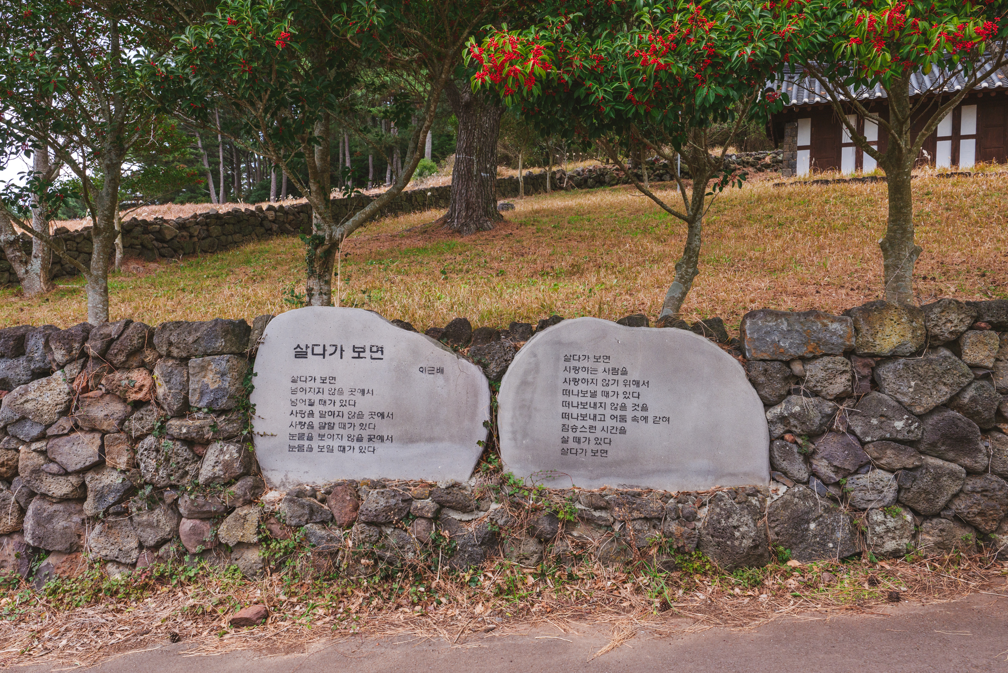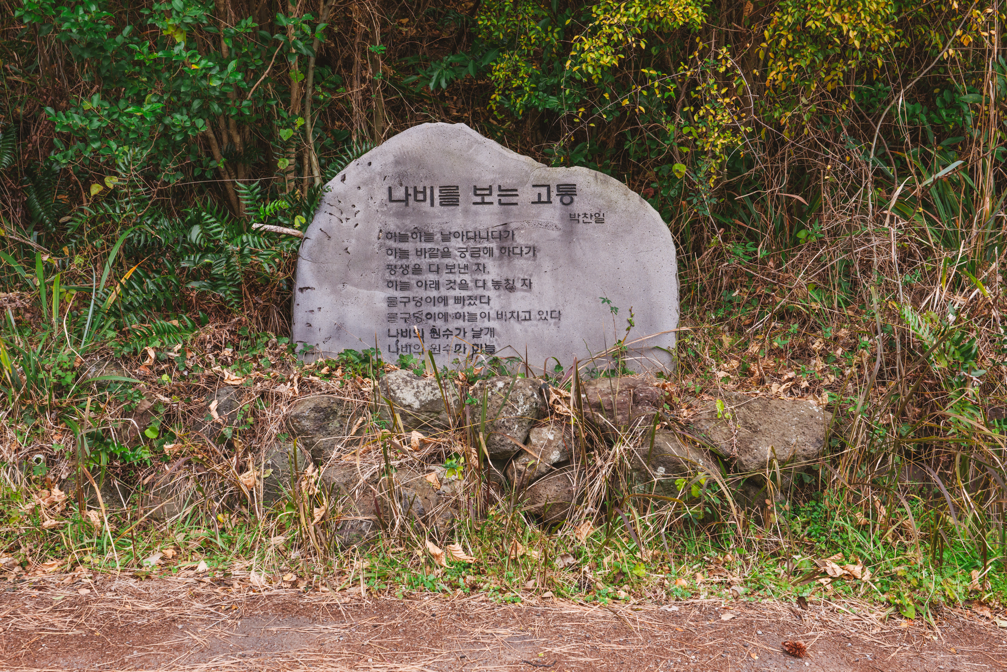 제주 애월 가볼만한곳 수산봉 충혼탑에서 저수지 주차장이 있는 입구 쪽으로 걸어가는 길에는 이근배 시인의 살다가 보면, 권혁우 시인의 애인은 토막 난 순대처럼 운다, 박찬일 시인의 나비를 보는 고통이라는 시를 차례대로 감상할 수 있어 문학 작품을 감상할 수 있는 이색적인 명소라 생각이 들었다.