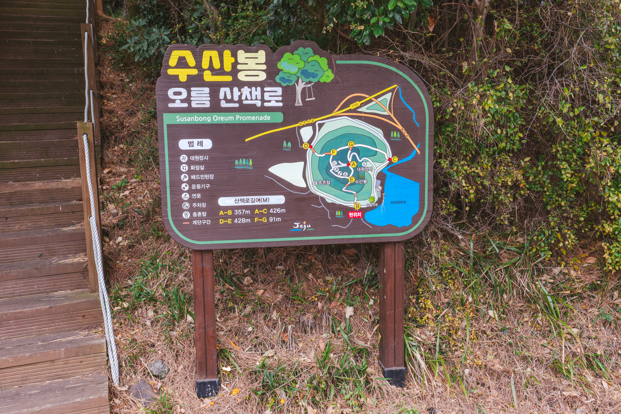 제주 애월 가볼만한곳 수산봉 정상으로 올라가는 입구 앞에는 오름 산책로에서 만나볼 수 있는 명소(대원정사, 배드민턴장, 운동기구, 저수지 연못, 충혼탑)가 상세하게 안내되어 있다. 참고로 3~4년 전에는 정상에 공중화장실이 있으나 항공 레이더가 설치되면서 없어졌고 앞서 봤던 드루쿰다 제주 애월점 카페 옆에만 화장실이 있다.