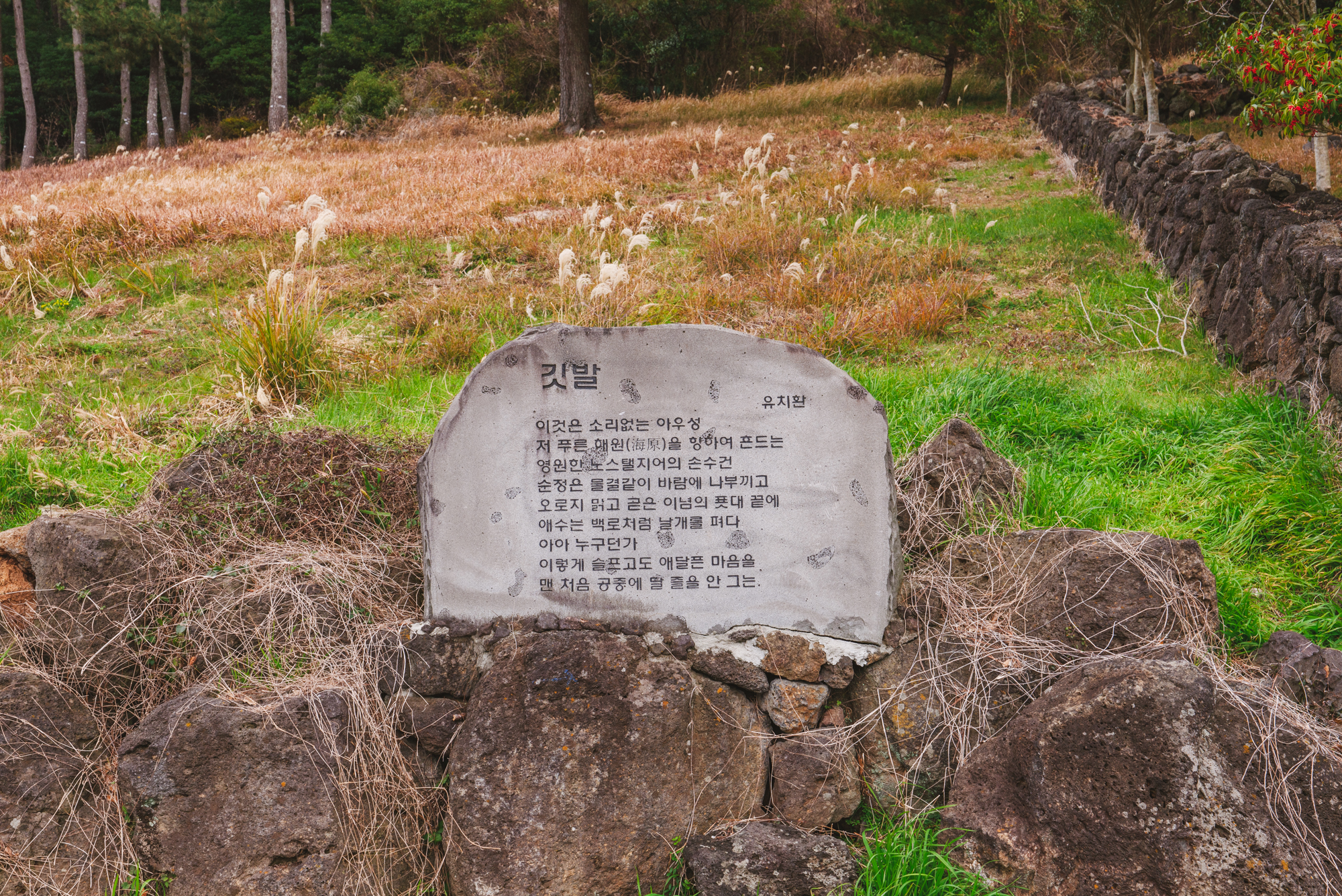 제주 수산봉 정상에도 저수지 앞 둘레길과 마찬가지로 비석에 남겨진 시를 볼 수 있다. 이재두 시인이 쓴 빗소리라는 시를 보니 실제로 비가 내리면 더욱 운치있는 분위기를 느낄 수 있을 것 같았다.