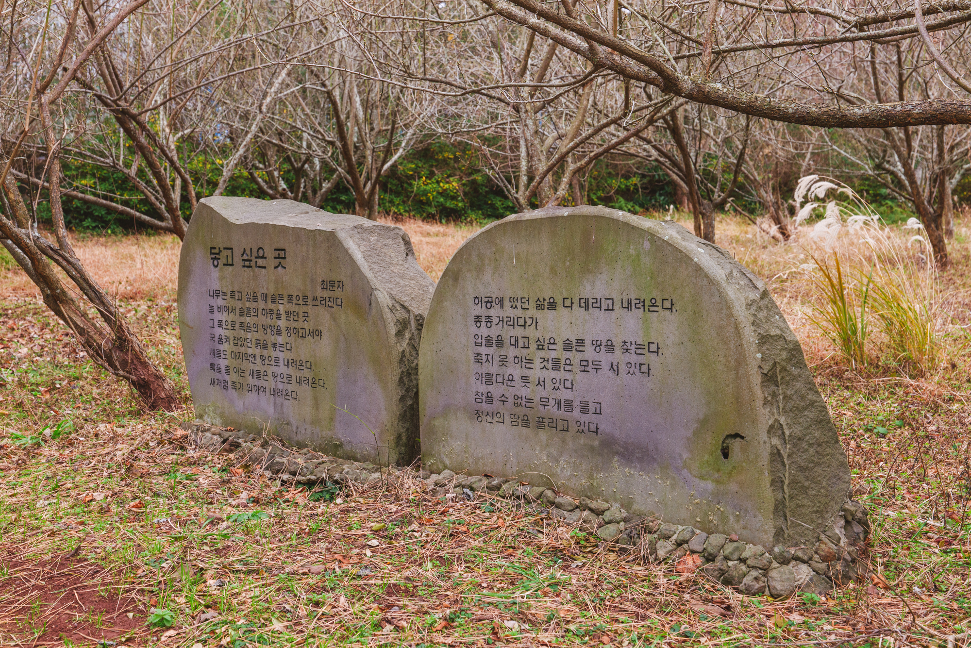제주 애월 가볼만한곳 수산봉 정상에는 앞서 올라왔던 길을 포함해 총 세군데로 나뉘어진 하산길이 있다. 이날은 제주 올레길 16코스 표식이 있는 길을 따라 걸어내려갔고 최문자 시인이 쓴 닿고 싶은 곳이라는 시가 담긴 비석도 만나볼 수 있었다.