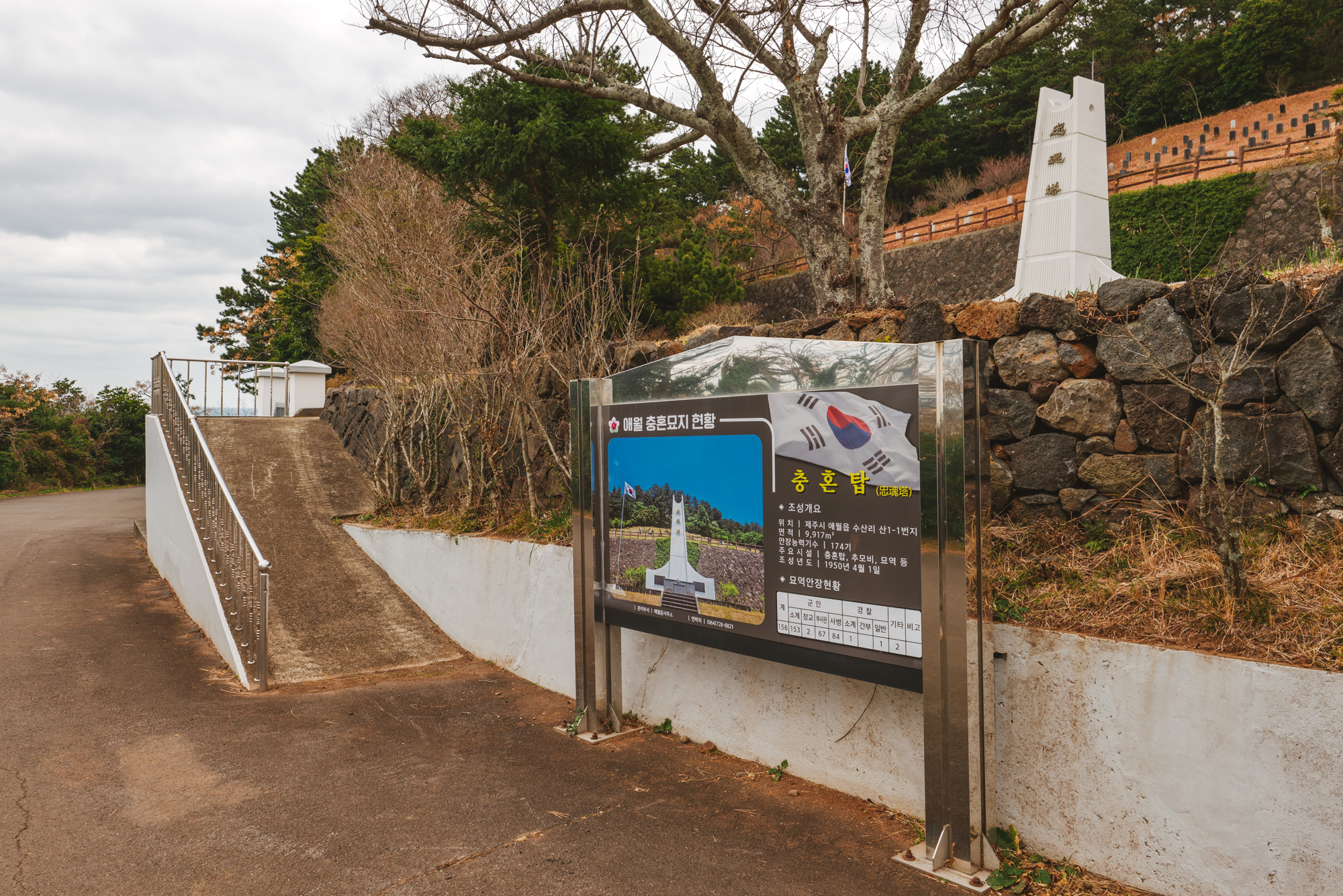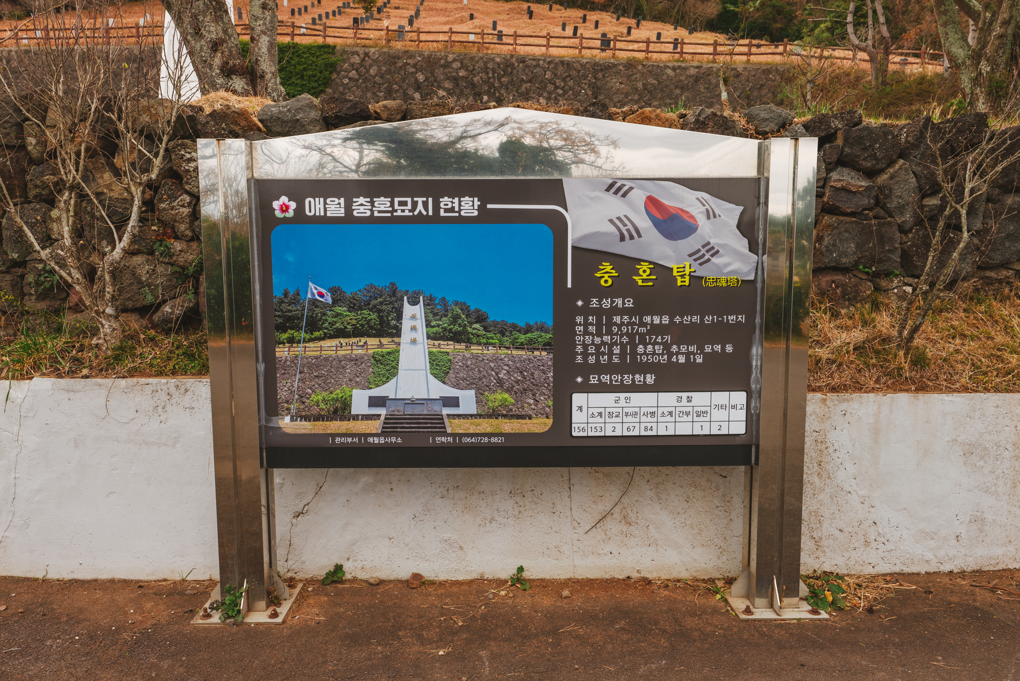 제주 올레길 16코스 애월 수산봉에는 충혼탑도 만나볼 수 있다. 1950년 4월 1일에 조성한 충혼탑에는 총 156개의 묘역과 함께 추모비가 설치되어 있었다.