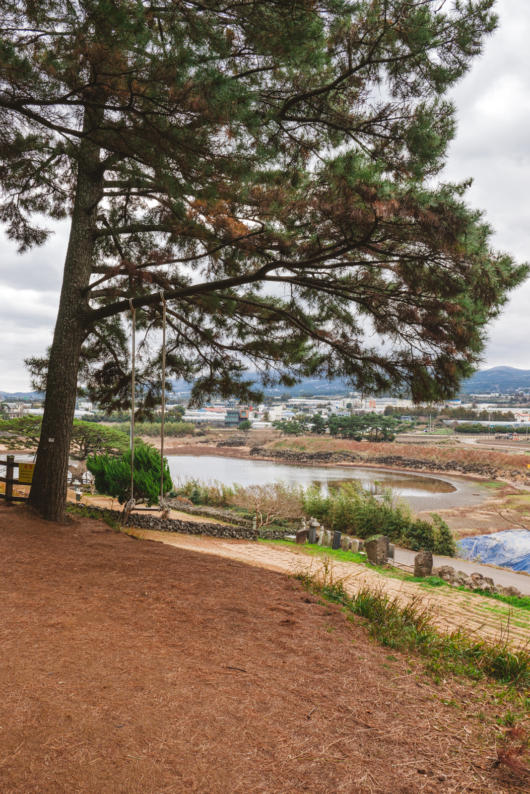 제주 올레길 16코스 애월 수산봉 입구를 따라 정상으로 올라가는 길에서 오른쪽으로 저수지가 보이는 곳으로 가면 곰솔만큼 커다란 나무에 수산봉 그네가 설치되어 있다.