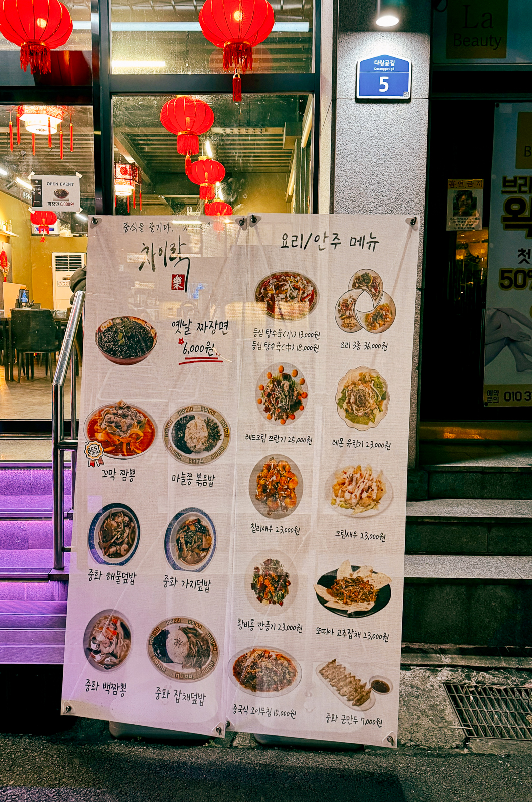 이전 오거리술차로 운영되던 곳에 새롭게 리뉴얼한 제주 노형 맛집 차이락에는 매장 내에서 먹을 수 있는 중화요리 메뉴가 가격과 함께 상세하게 표시되어 있으며 오픈 이벤트로 짜장면을 6,000원에 먹을 수 있는 안내문이 있었다.