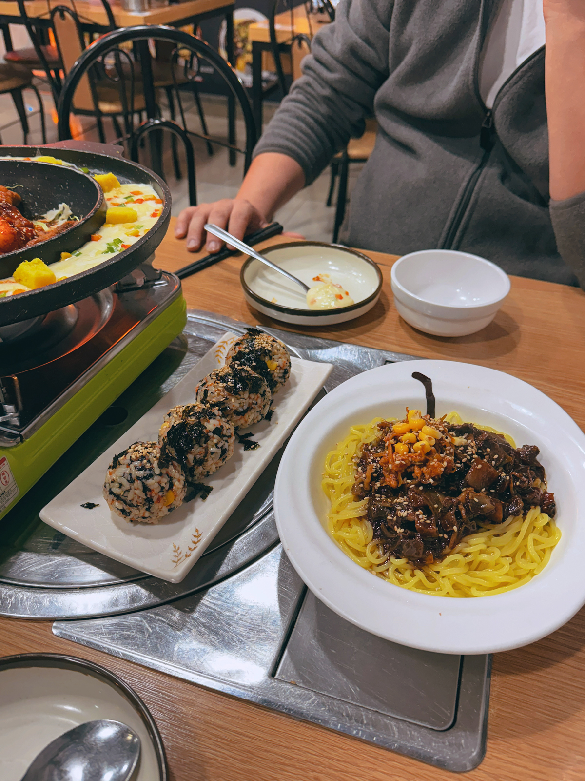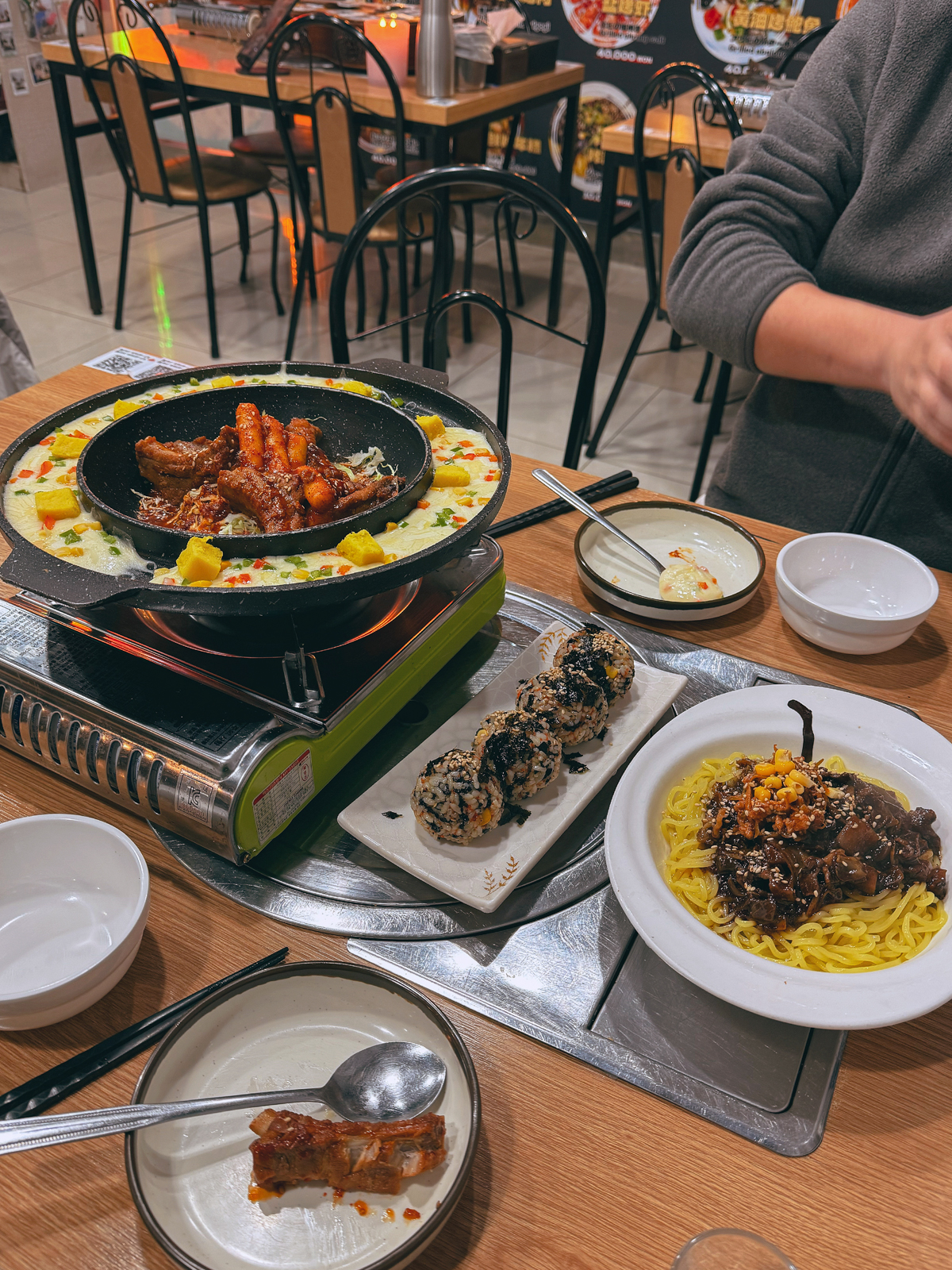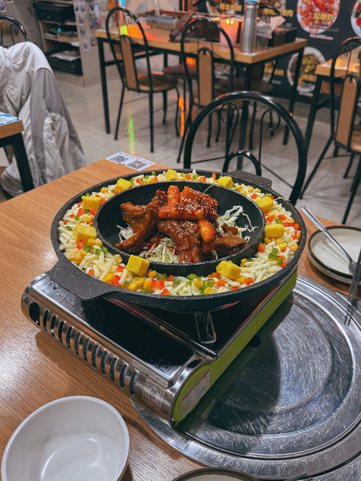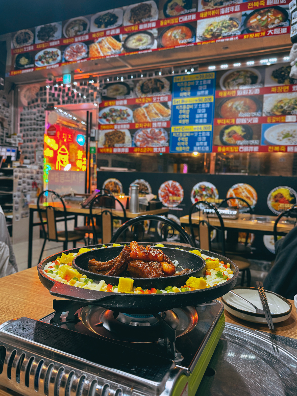제주 누웨마루거리 맛집 짝 치즈등갈비에 방문했던 날에는 메인 요리인 치즈등갈비를 주문했다. 메뉴를 주문하고 기다리면 버너와 함께 치즈가 듬뿍 들어간 등갈비가 나오며 떡볶이도 포함되어 있었다.