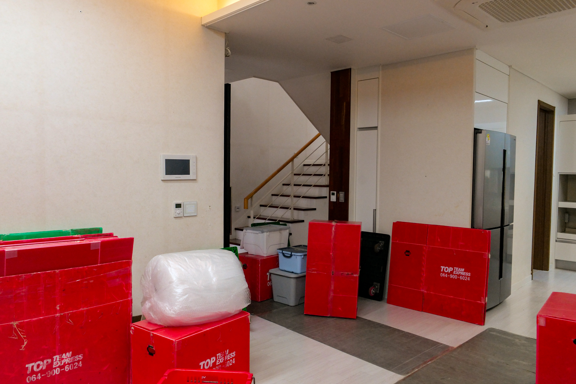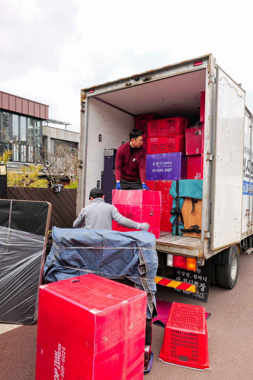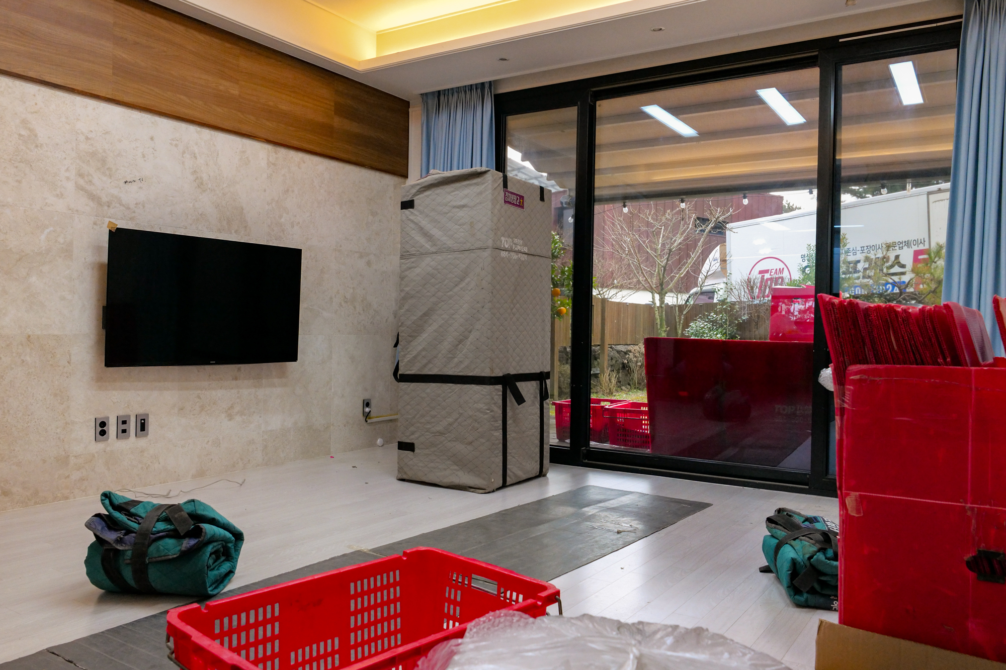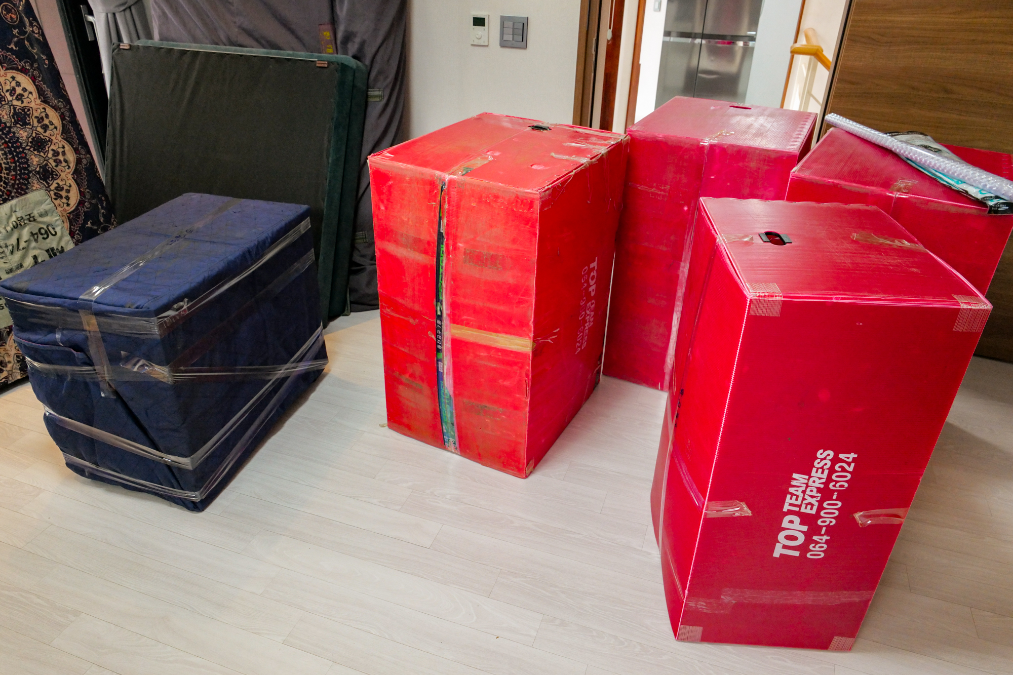 견적 비용을 받고 제주도 이사를 할 때는 여러 명의 기사님이 동원되어 거실, 주방, 방에 있는 물품부터 차례대로 포장했다. 냉장고인 경우 바닥이 휩쓸리지 않게 장판을 길게 세팅했고 다른 물건도 파손되거나 훼손되지 않게 꼼꼼하게 처리를 해주어 시작부터 믿음이 갔다.