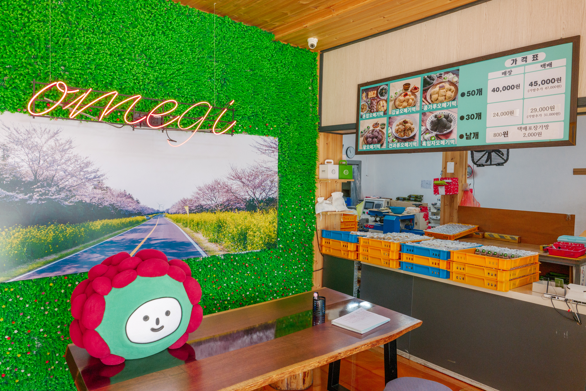 오메기떡 본연의 맛을 추구하며 팥오메기, 견과류, 콩고물, 흑임자, 감귤, 약밥 중 선택할 수 있으며 매장 방문 후 선물하기 좋게 포장이 가능하며 공항 기내반입도 된다.