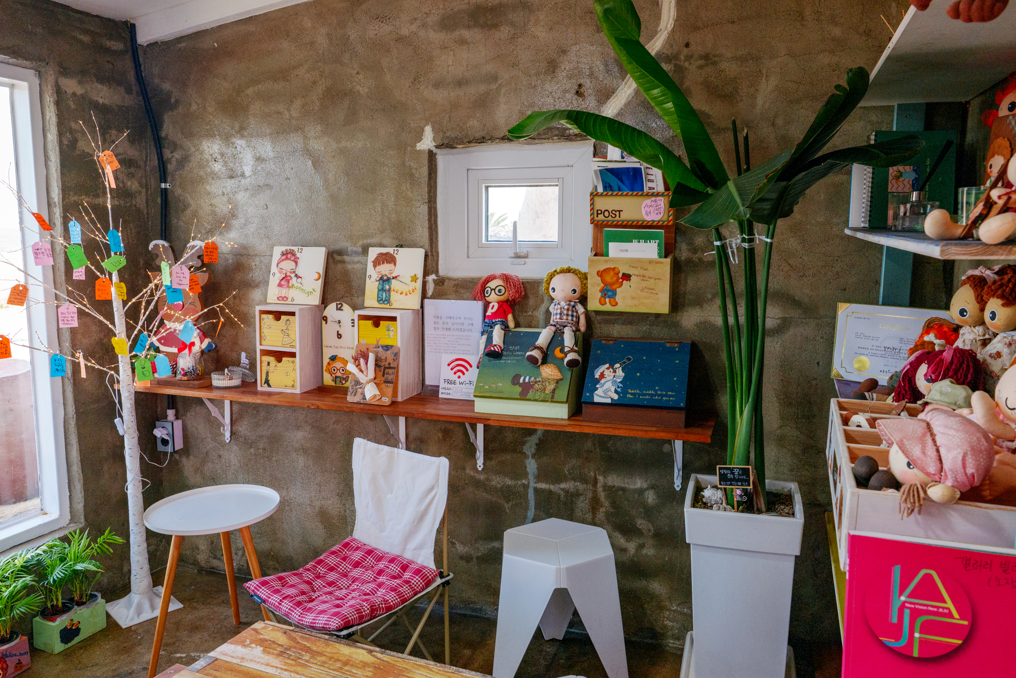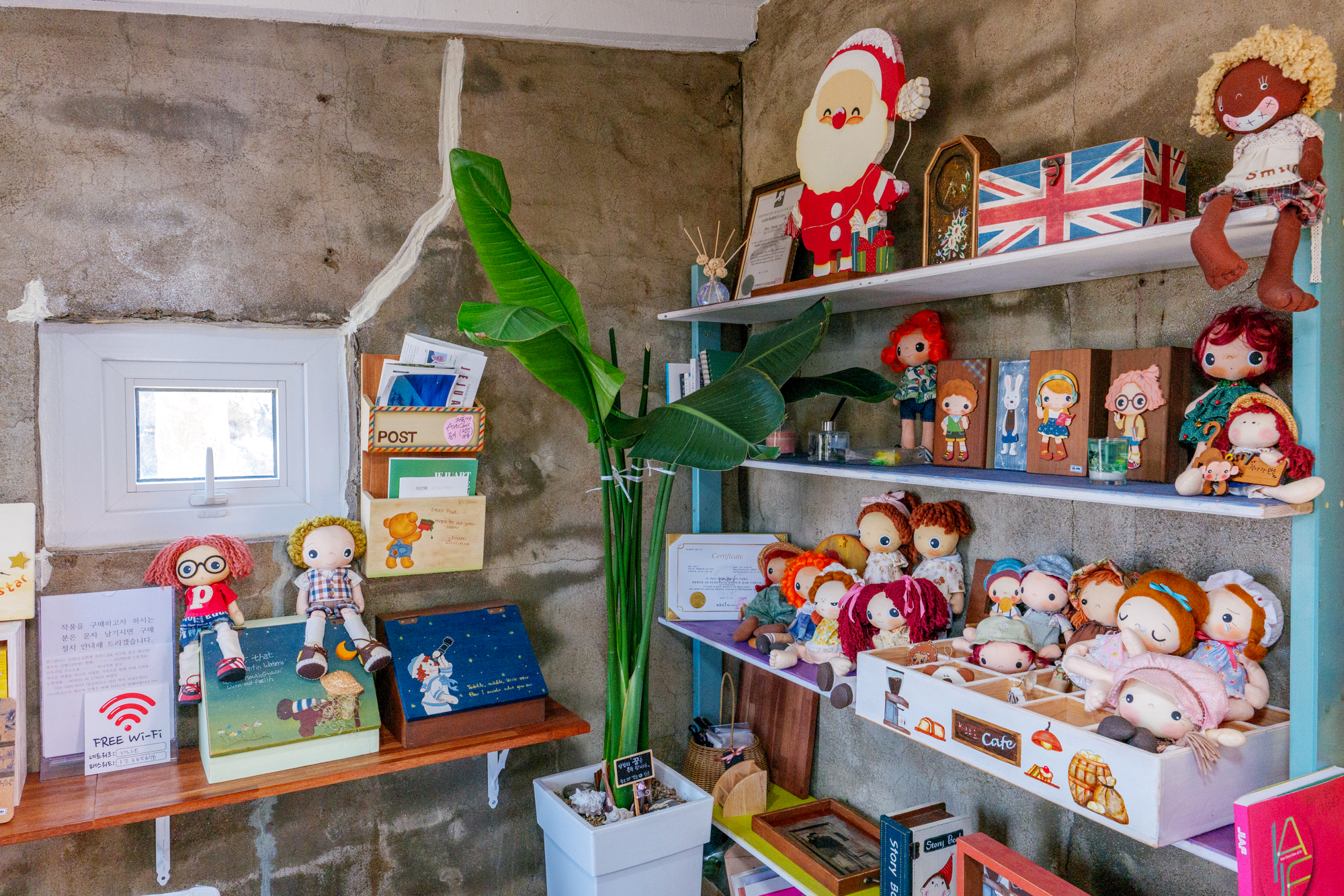 갤러리 공간에서 나와 바닷가 방향에 있는 건물로 가면 무인카페를 만날 수 있다. 제주 서쪽 카페 빌레로 들어가면 다양한 인형이 전시되어 있는데 따로 판매하는지 모르지만 인테리어 소품으로 두기 좋은 고퀄리티를 자랑했다.