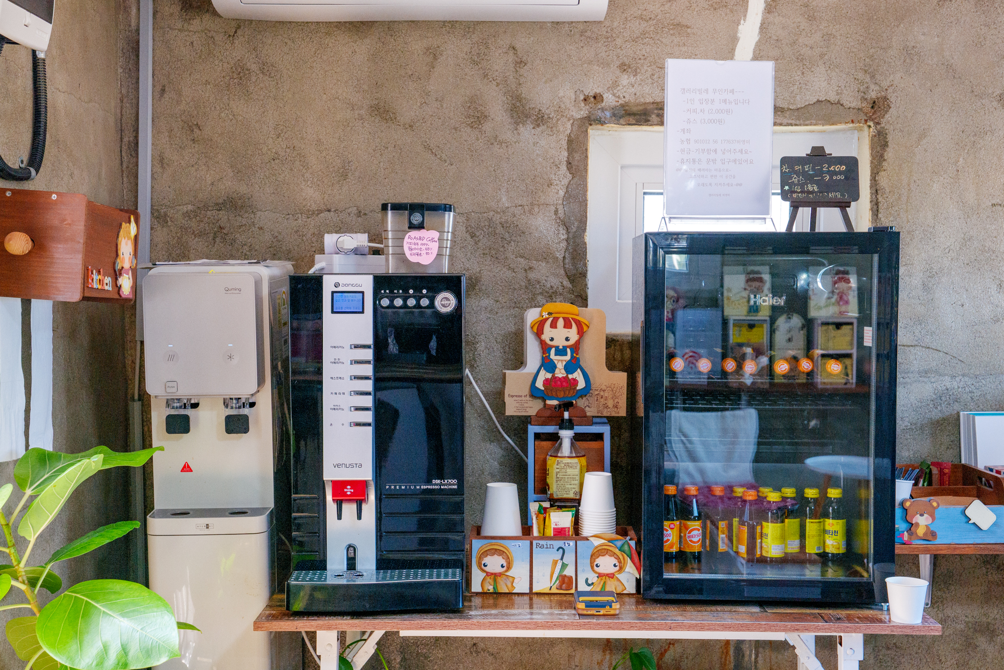 무인카페답게 정수기, 커피머신기가 설치되어 있어 비용을 내고 직접 커피를 추출해 마실 수 있다. 커피뿐만 아니라 병음료수와 주스도 냉장고에 진열되어 있어 제주도 뚜벅이 여행을 하다가 연대마을, 연대포구에 간다면 가볍게 들려보기 좋다.
