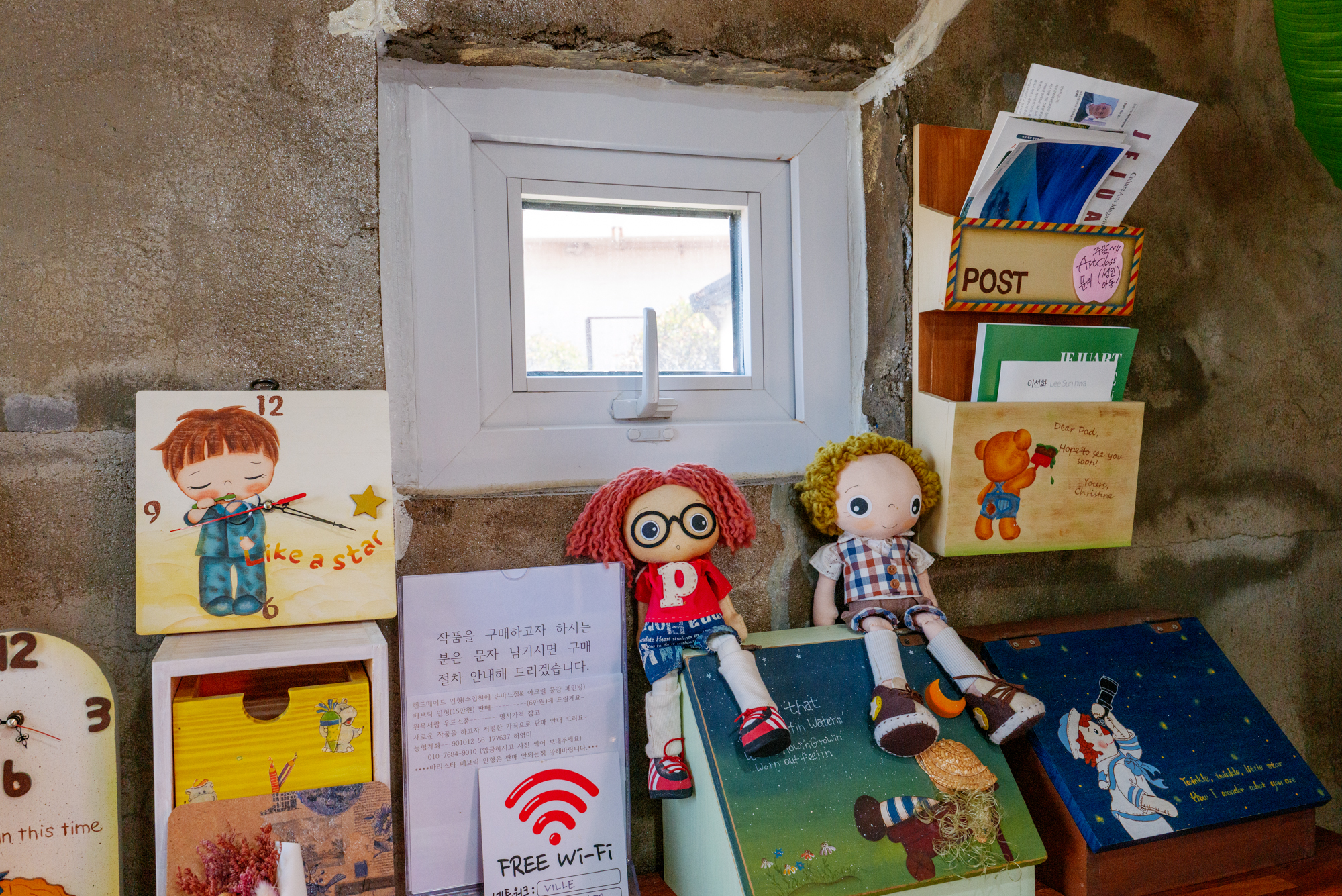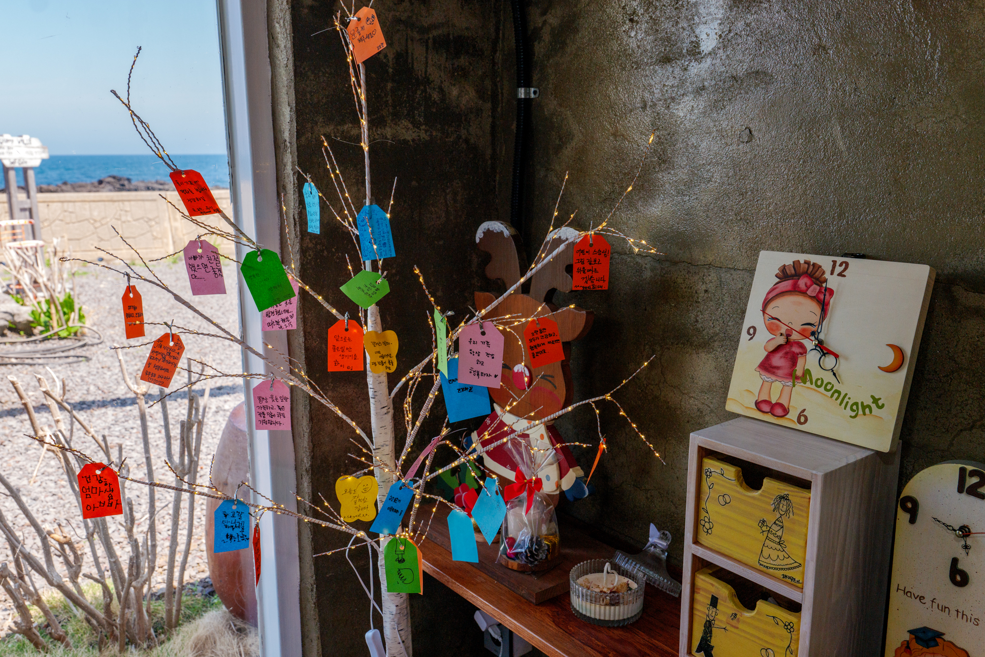 제주 무인카페 빌레에는 아기자기한 인형과 함께 제주도 풍경을 담은 엽서와 이곳에 다녀간 이들이 남긴 포스트잇을 걸어둔 화분 등 볼거리도 다양했다.
