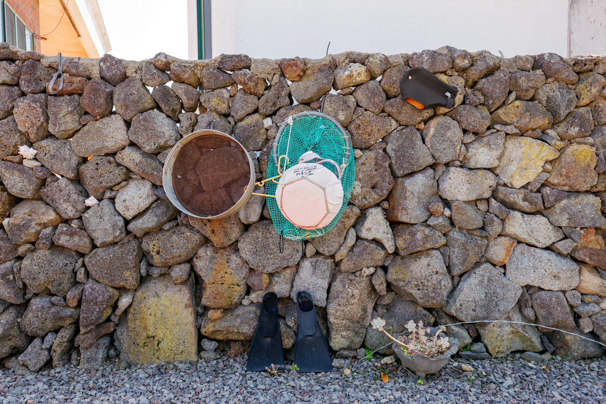 제주도 뚜벅이 여행 제주 서쪽 카페 빌레로 가는 길에는 야자수를 포함해 여러 꽃으로 조경이 꾸며져 있었고 한쪽 공간에 있는 돌담에 해녀 도구를 두어 제주살이를 하는 나조차도 타지역으로 여행을 온듯한 느낌을 받았다.