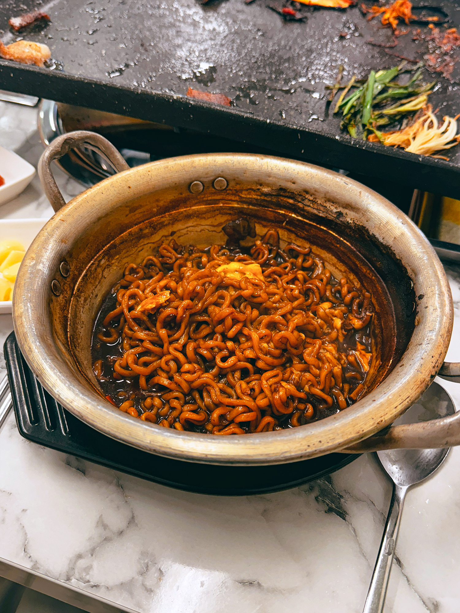 사이드로 주문했던 짜계치는 일명 짜파게티+계란+치즈로 6,000원이라는 착한 가격에 먹을 수 있다. 고기를 먹고난 후 추가로 주문해 2명이 함께 나눠 먹었는데 집에서 먹던 짜파게티보다 더욱 맛있었다.